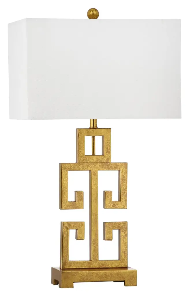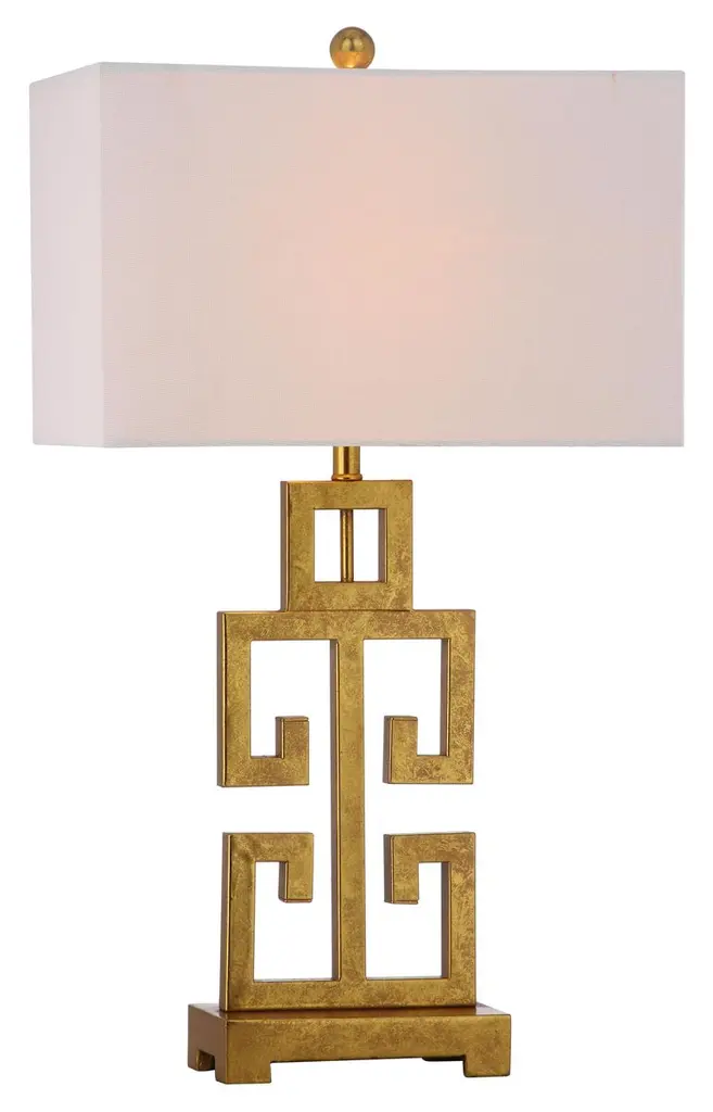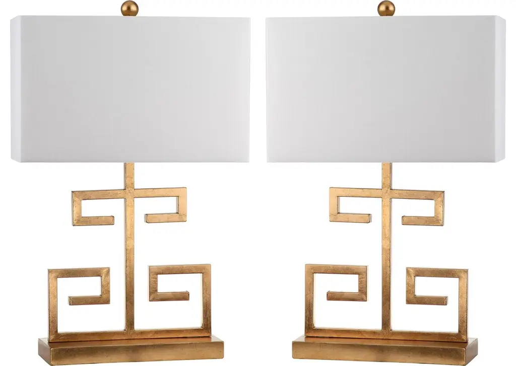 Infinitely versatile and adaptable to myriad of decorating styles, the set of table lamps features the iconic Greek symbol. The design is crafted of antique gold-finished metal with a rectangular box shade in white textured cotton.