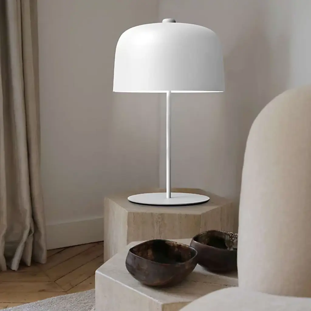 Presented by Luceplan, the Zile Table Lamp embodies the perfect fusion of sustainability and contemporary design. Crafted in Italy, the lamp's PLA diffuser is made from a bio-durable polymer with 80% renewable sources, showcasing Luceplan's commitment to eco-conscious practices without compromising on style. The lamp's steel build ensures durability and longevity. Designed by Archirivolto, the Zile Table Lamp boasts a clean and streamlined aesthetic, featuring a slender stem, rounded base, and a bell jar silhouetted shade.