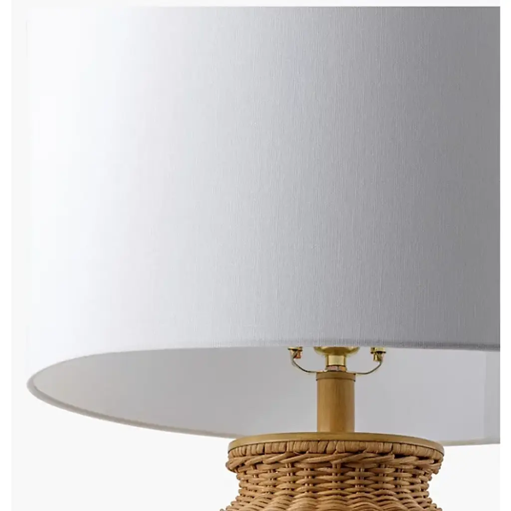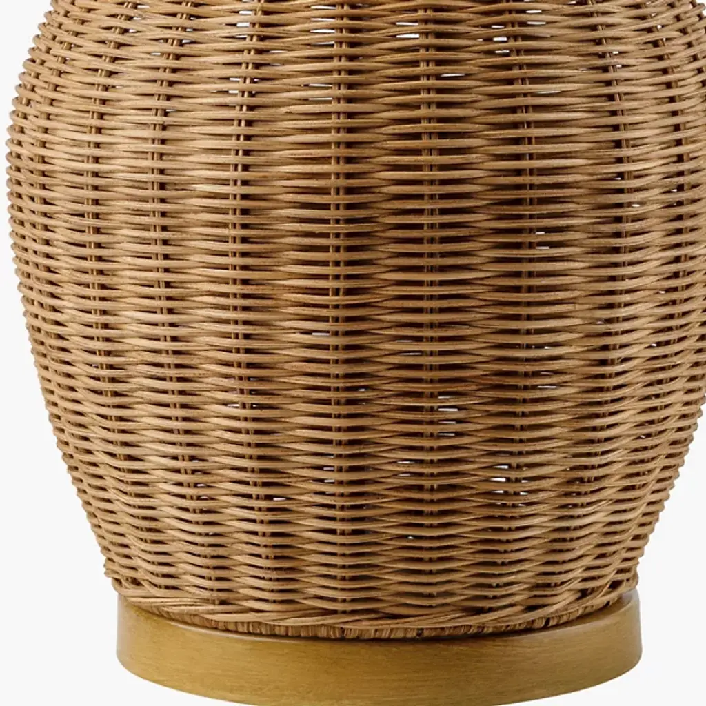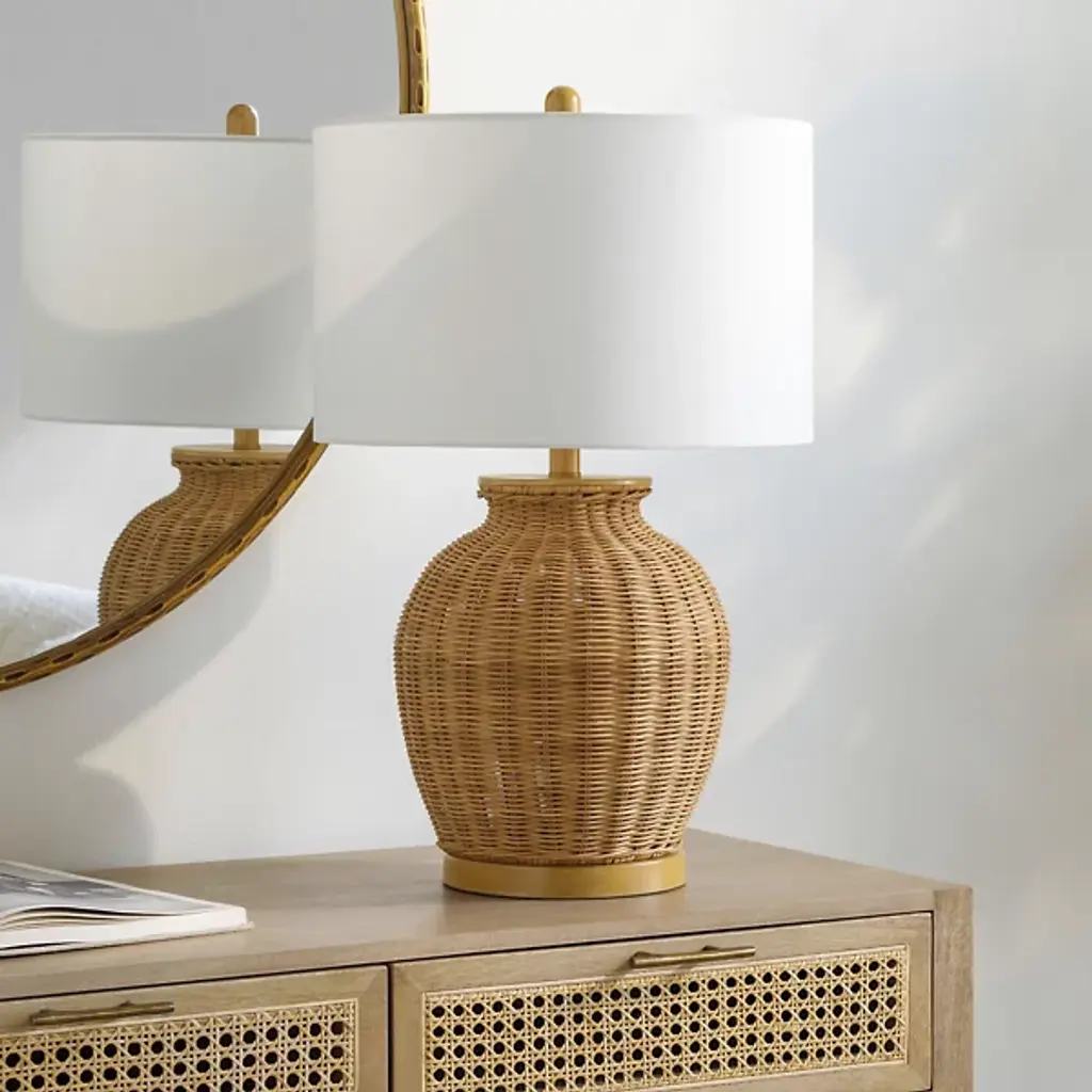 The Ziran Table Lamp from Surya brings handcrafted texture front and center through its rattan construction. Natural fibers woven into a sturdy base support a classic drum shade crafted from linen—a material pairing that speaks to cottage sensibilities without veering into cliché. The iron finial provides a subtle counterpoint to the organic materials below it. Light filters through both the weave of the base and the linen shade above, creating layers of warmth that enhance country-inspired interiors. This lamp occupies the middle ground between decorative accent and practical lighting solution.