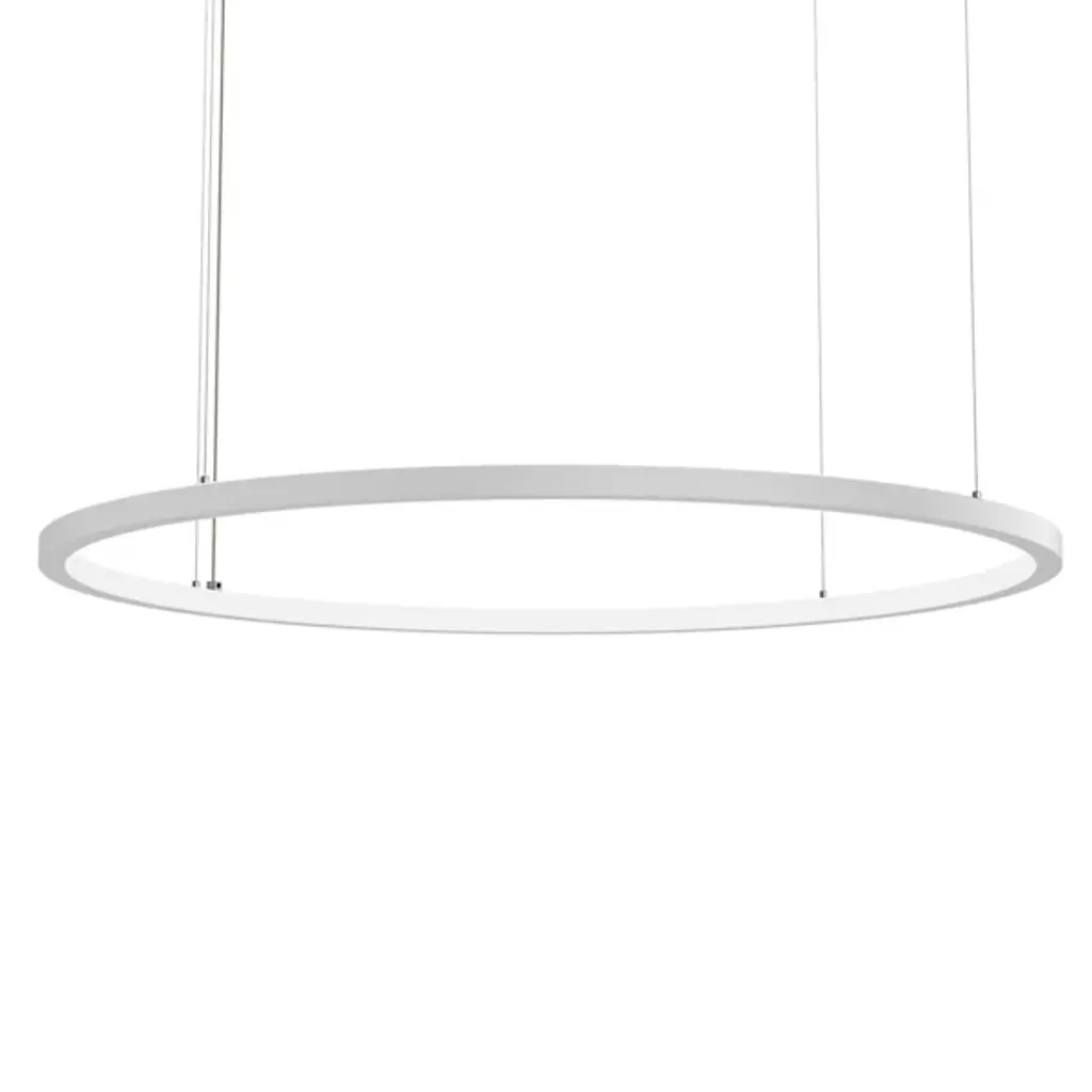 A clean, contemporary addition to large inside spaces. The Zirkol Oval LED Linear Suspension from Nemo offers style and stable functionality in one smooth package. A series of small anchor points send slim wires to a large, oval hoop housing of anodized aluminum below. The aluminum body sandwiches strong and energy-efficient lamping between its metal walls, capped off by a translucent inset diffuser that transforms bright downlight into a more mellow glow that brings a stylish mix of task light and ambiance to its surroundings.