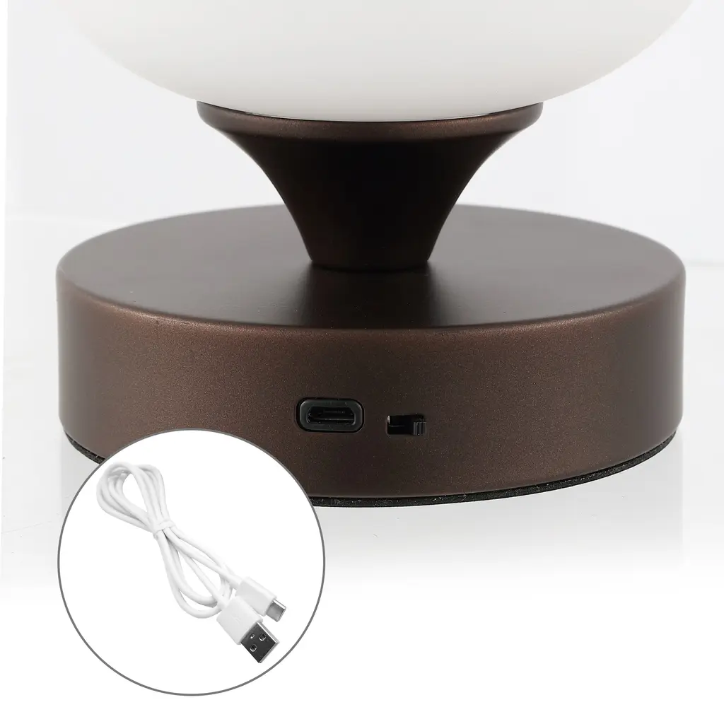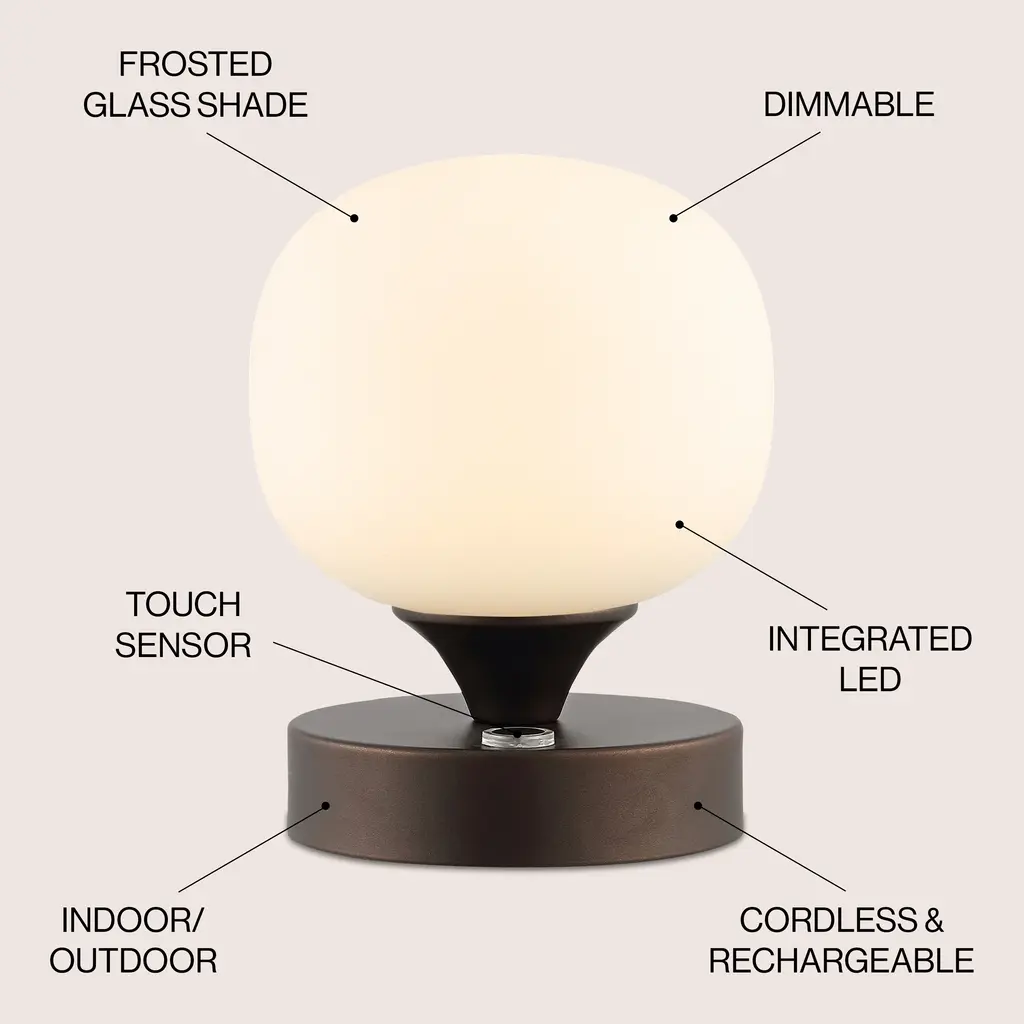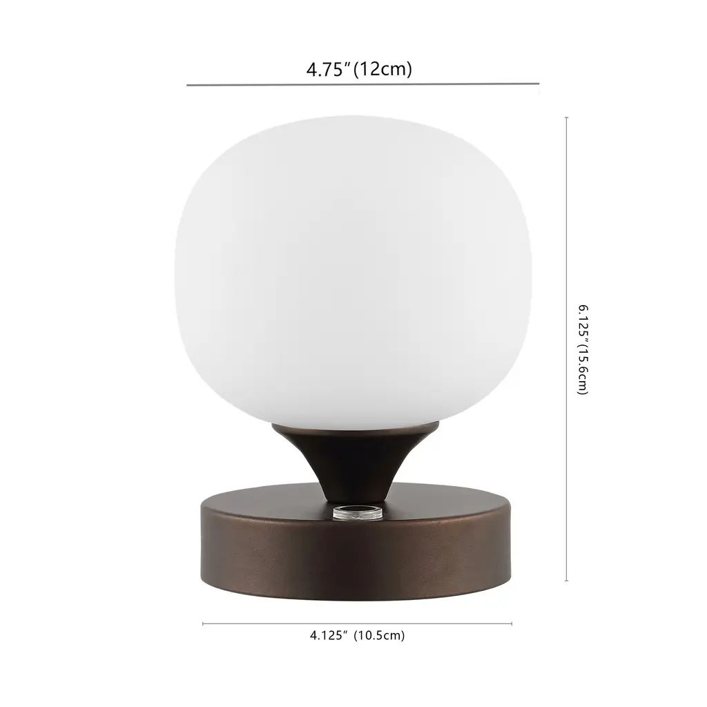 Add modern flair to your bar, console, or vanity with our 5" tall glass and metal accent lamp. This cordless, rechargeable mini lamp is the perfect minimalist accent for your dining room, living room, bedroom, or entry. A single LED bulb in a frosted glass globe provides soft accent lighting, with clean lines and a high-quality finish. Features: Dimensions: About us: You see a lamp.We see a decorative work of art.A perfectly curved shade casts a dramatic shadow on a floor. A silk cord you never want to hide. Compatible with LED lightbulbs: as easy on the environment as they are on the eyes. The JONATHAN Y Lighting collection considers every detail from impeccably sourced materials to designer styling. And our prices are so attractive, we've transformed a functional necessity into a fashion accessory.JONATHAN Y Lighting - a fashion revolution in home decor.