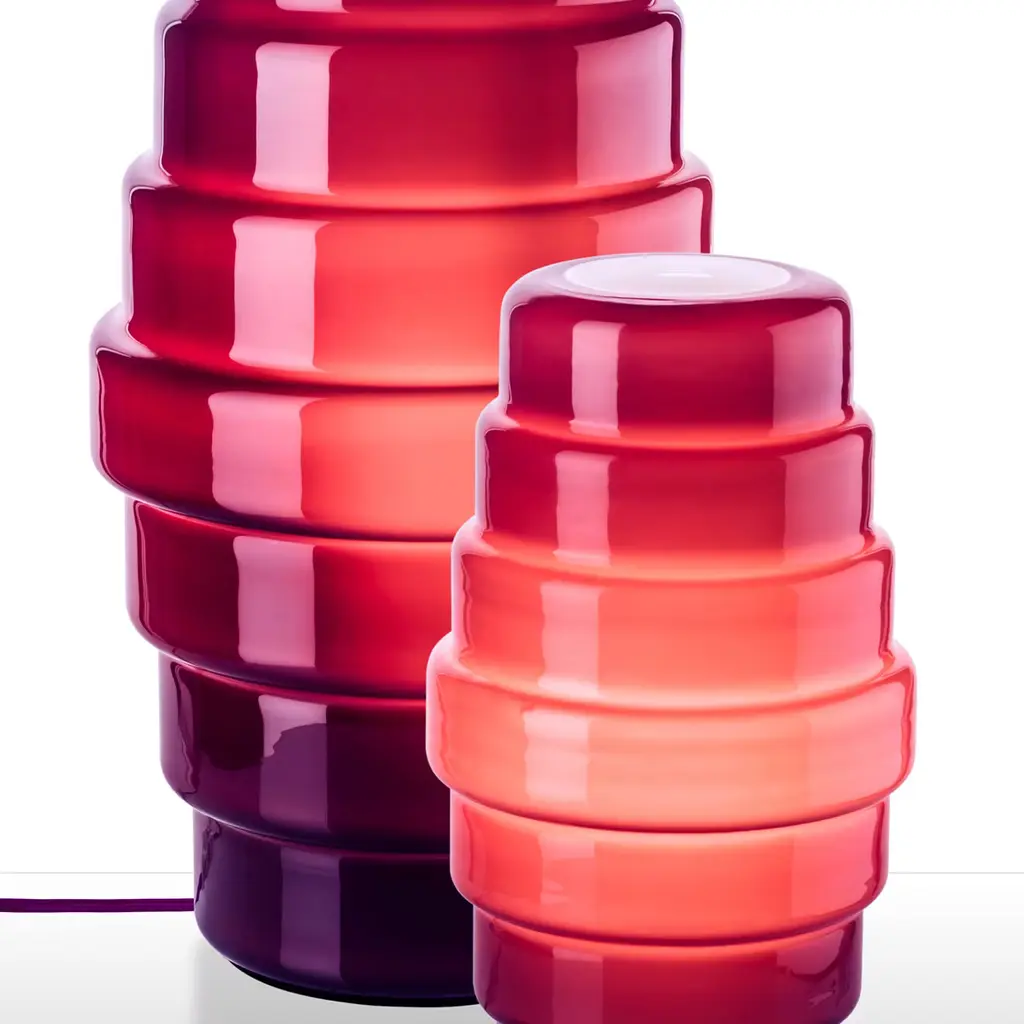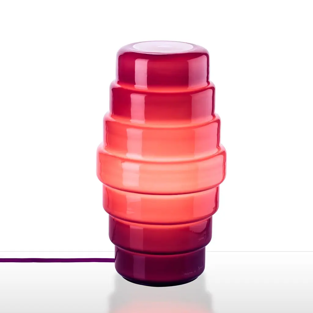 Stylish and modern, this table lamp was designed by the duo Doriana and Massimiliano Fuksas in 2014. The concentric bands are handmade with the opaline technique that confers a semi-opaque finish to the purple-colored glass. Available in two different sizes and three colors (purple and taupe), this table lamp holds a single halogen E27 max 70W bulb and is also suitable for CFL bulbs.