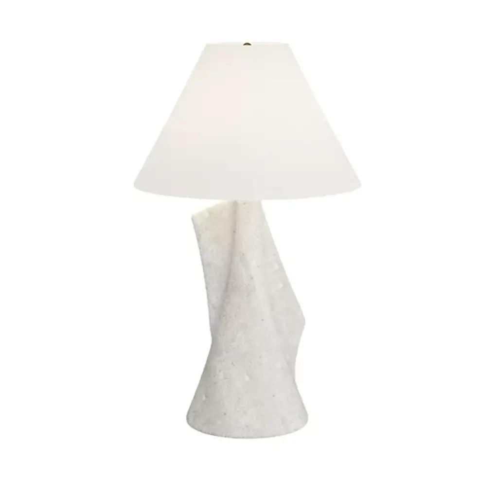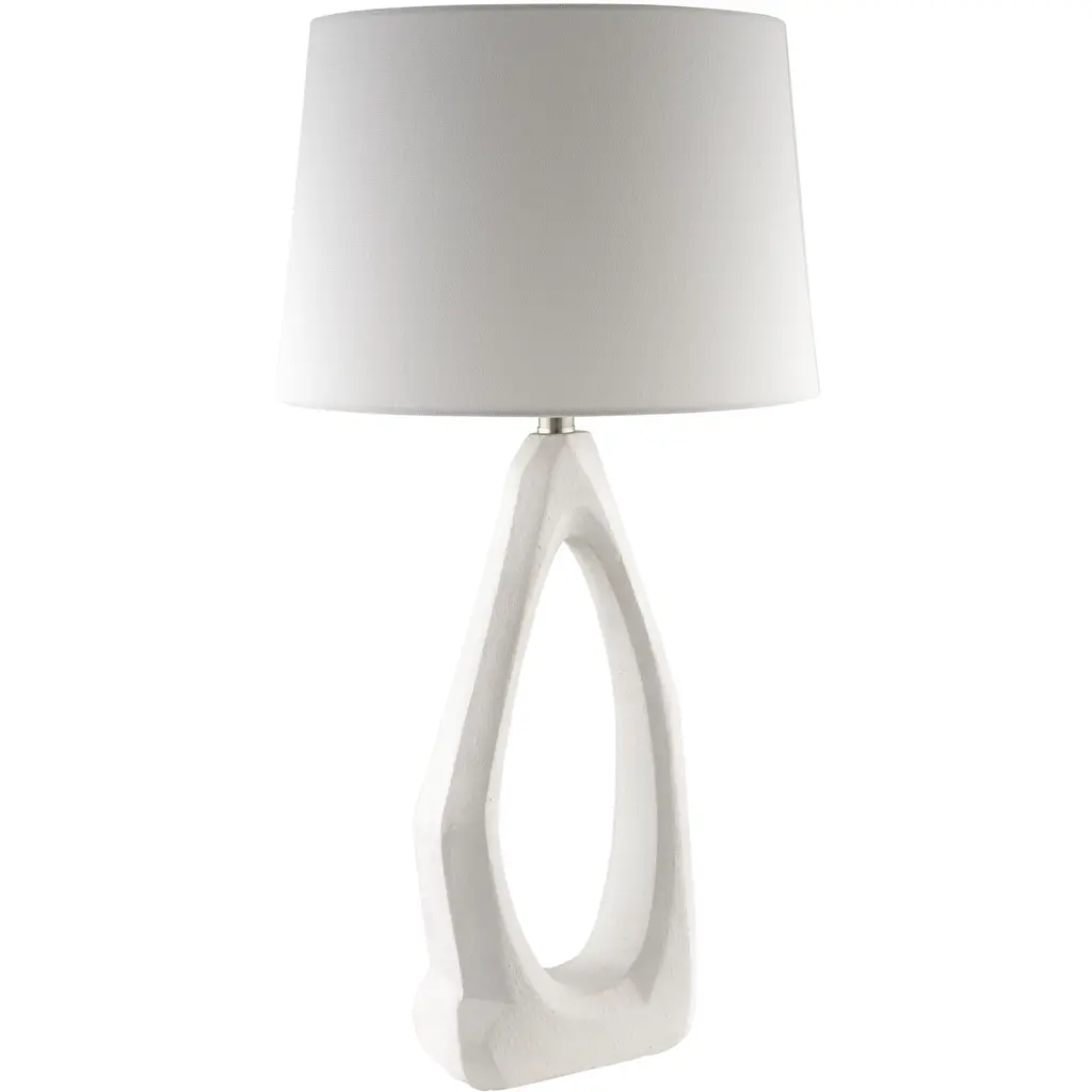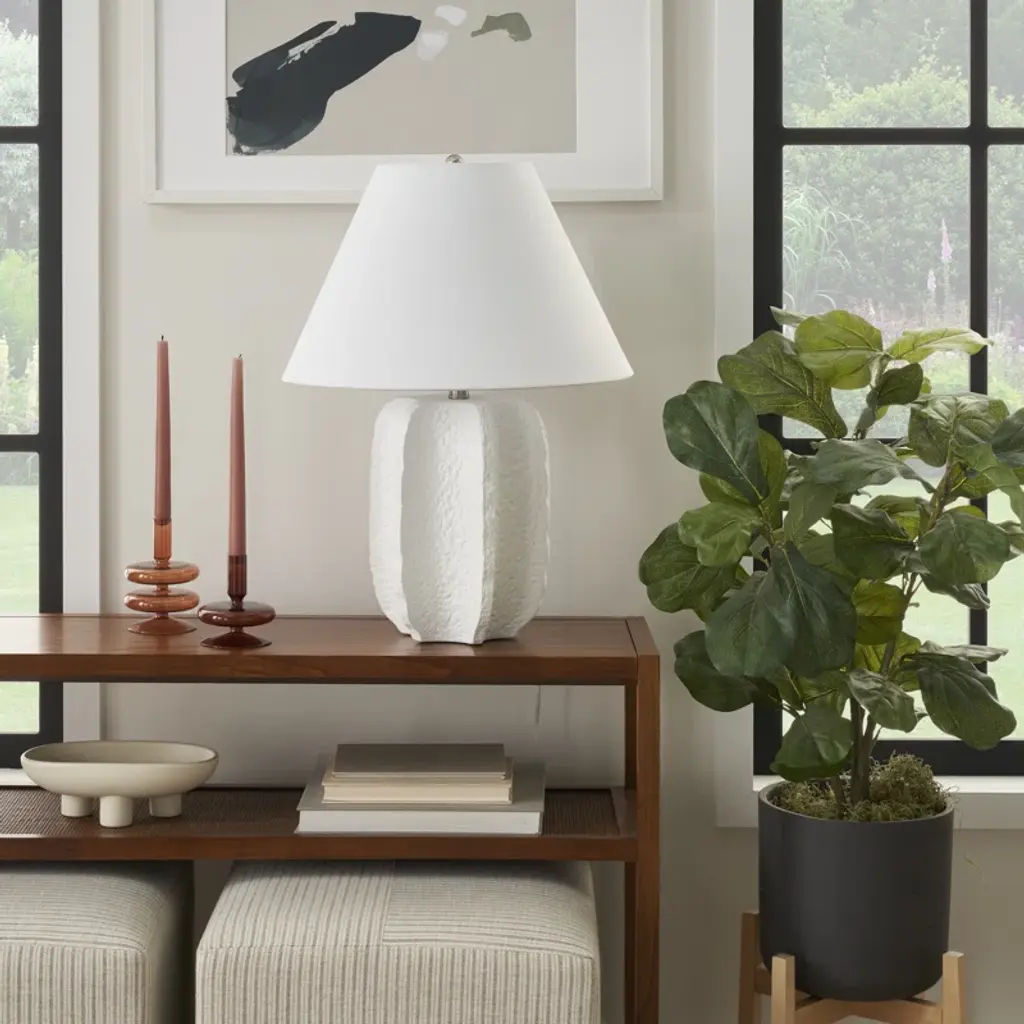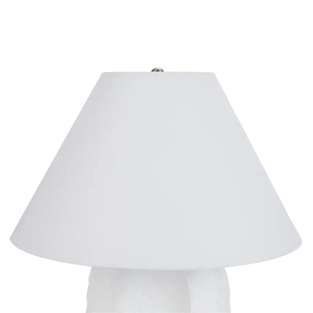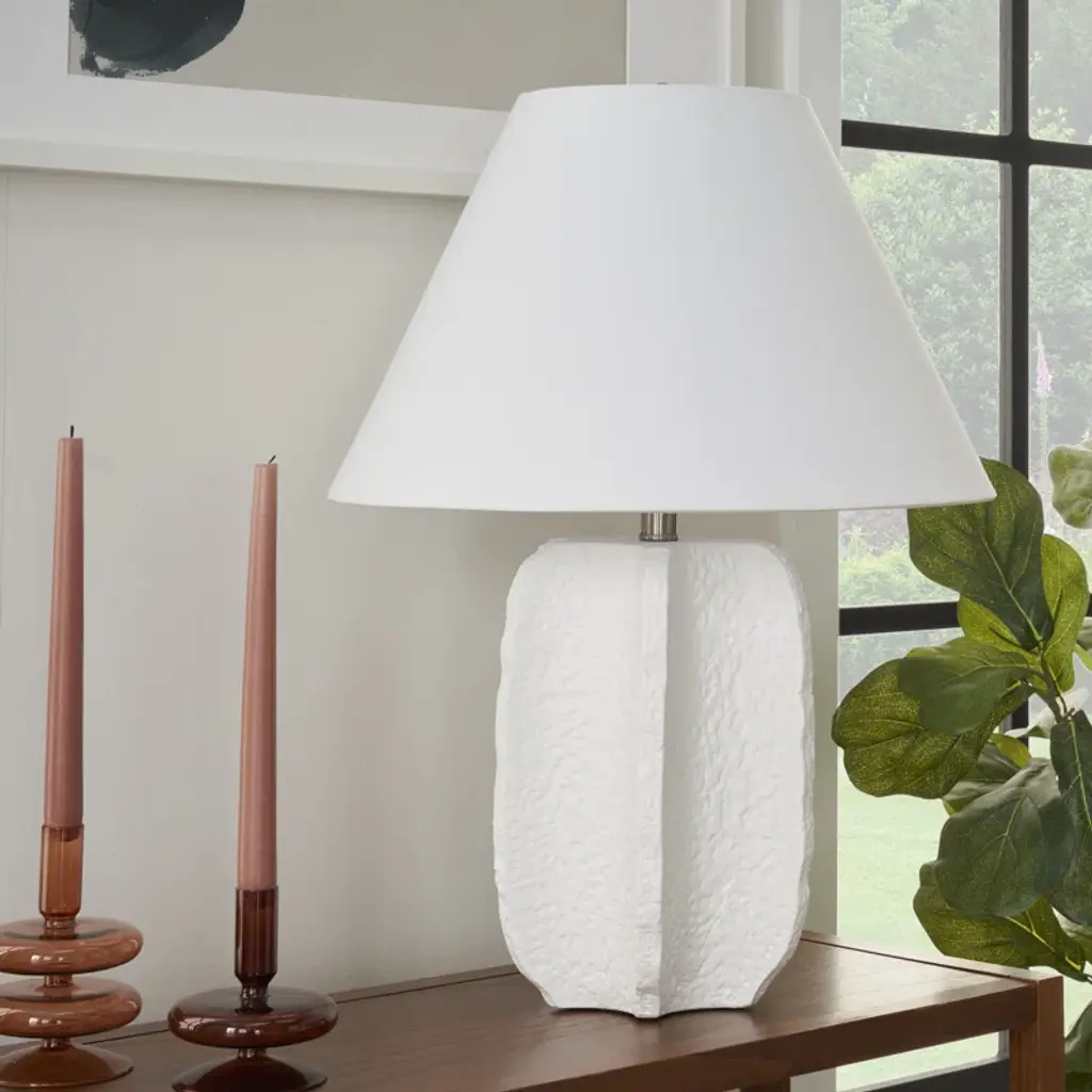 Exuding an air of refined simplicity, this modern table lamp showcases a beautifully textured ceramic base, reminiscent of fine plasterwork. Its crisp white finish embodies understated elegance, effortlessly elevating any decor. Topped with a tapered white shade, the lamp luminates, making it an ideal accent piece for contemporary interiors.
