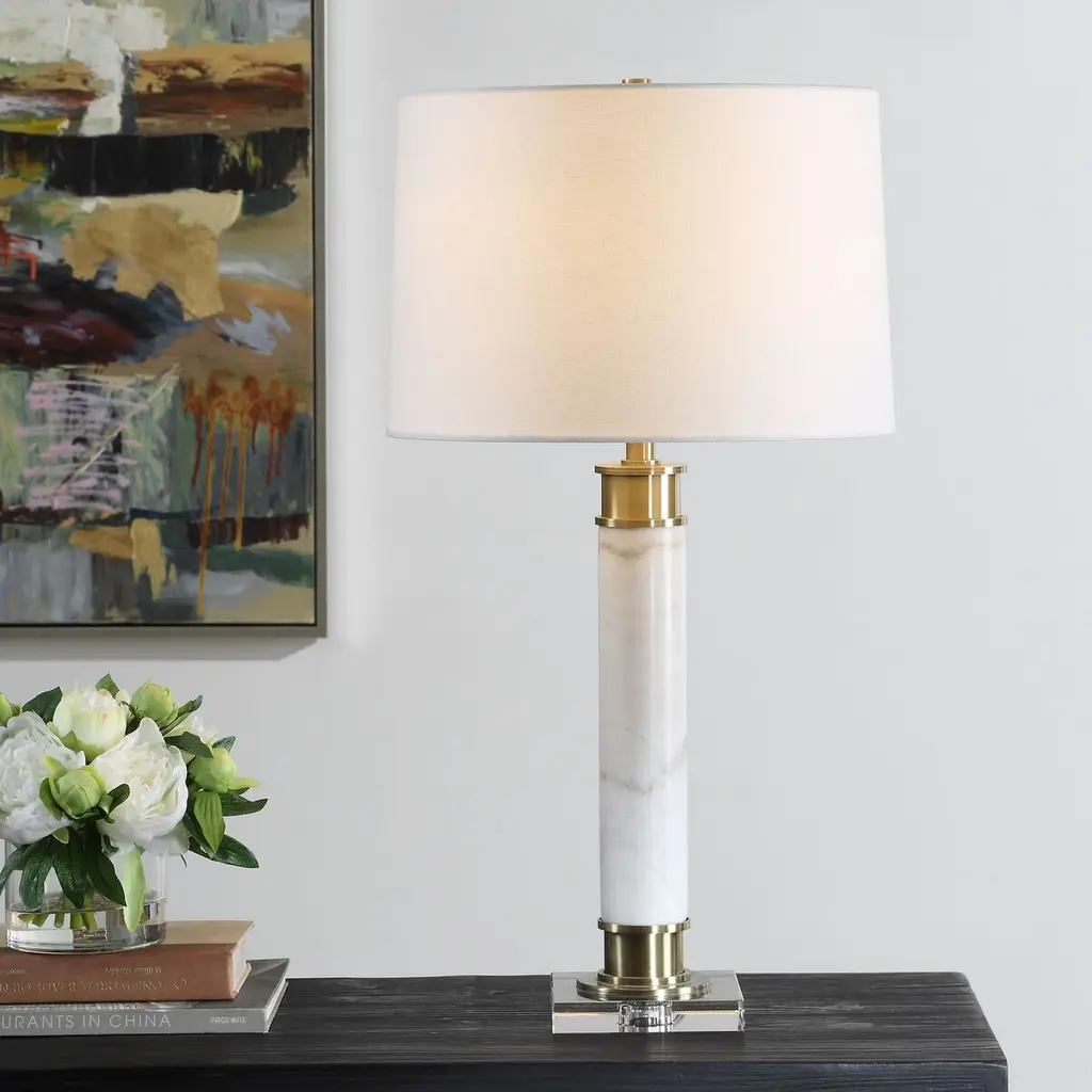 The Zoraida Table Lamp is a stunning piece that exudes elegance and sophistication. Its base is crafted from exquisite marble, showcasing subtle veining that adds a touch of natural beauty. The lamp is elevated by a thick crystal foot, providing a sturdy and luxurious foundation. Accents of plated antique brass enhance its timeless appeal, while a slightly tapered hardback shade in crisp linen fabric completes the look with a refined touch. This lamp is a perfect blend of classic design and modern elegance, making it a versatile addition to any interior space.