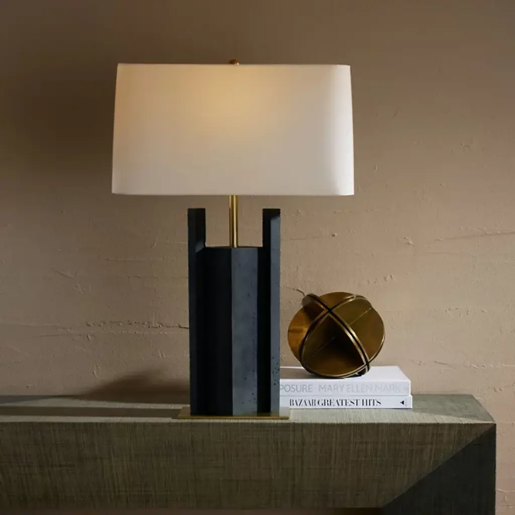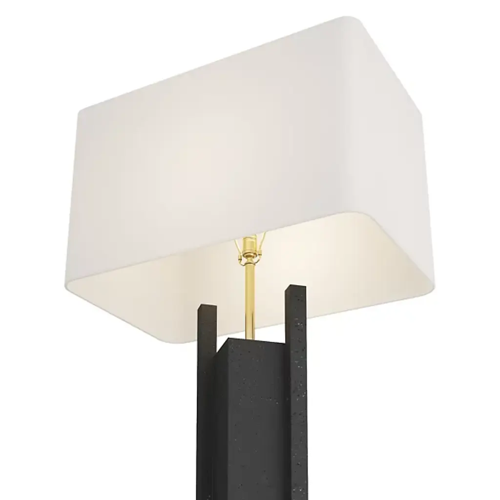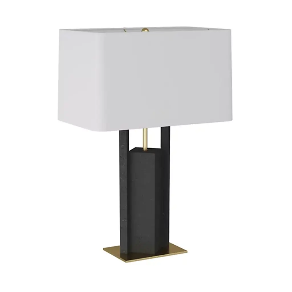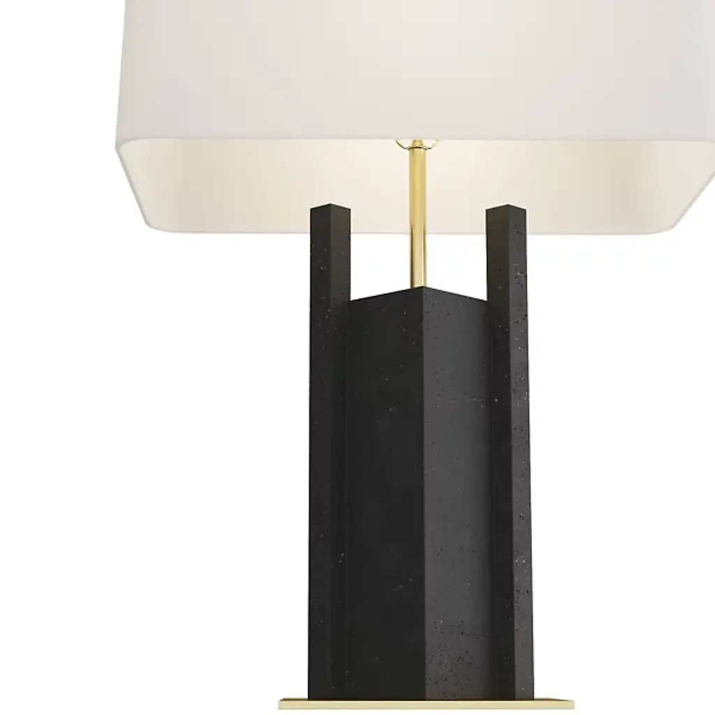 The Zory Table Lamp from Arteriors redefines tradition with a modern, geometric form. Crafted from ricestone composite in a sophisticated charcoal hue, it exudes contemporary allure. An antique brass support and base provide a striking contrast, adding a touch of masculinity to this modernist accent. It's a stylish statement for any room, crowned with a rectangular drum shade in off-white microfiber lined in cotton and featuring a taupe cloth-wrapped cord with a three-way rotary switch.