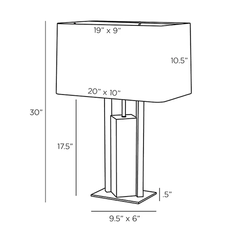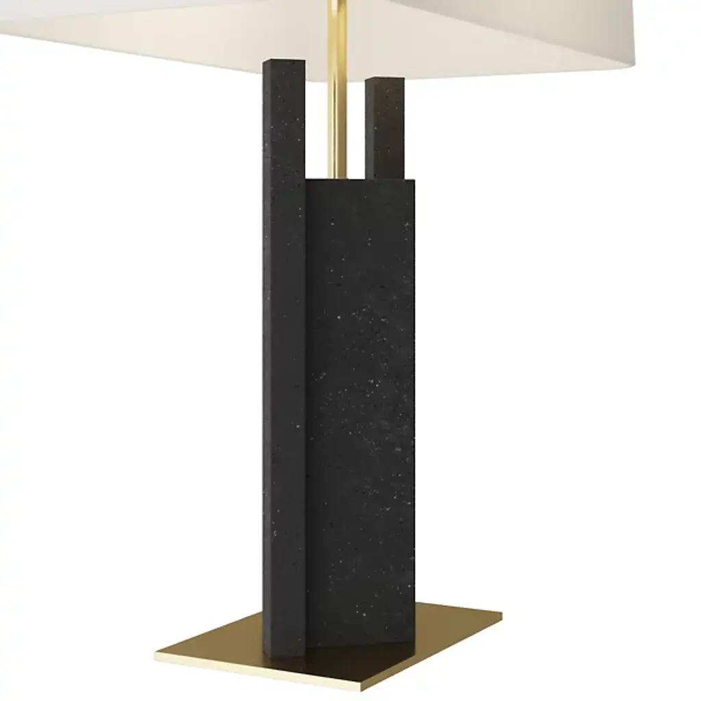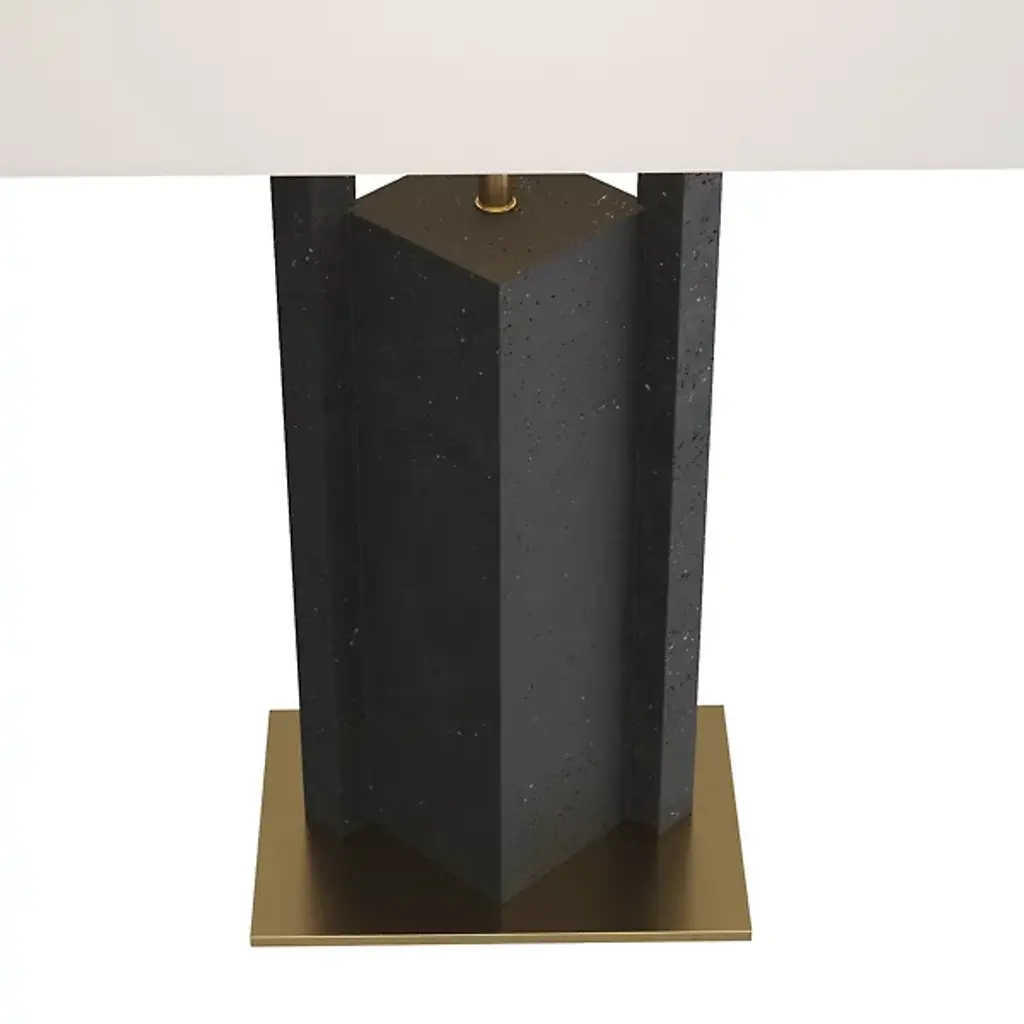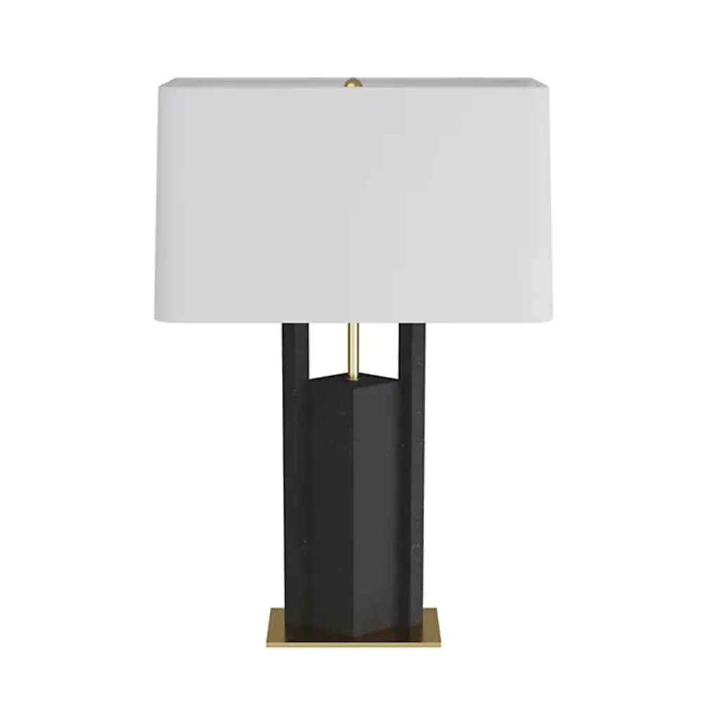 The Zory Table Lamp from Arteriors redefines tradition with a modern, geometric form. Crafted from ricestone composite in a sophisticated charcoal hue, it exudes contemporary allure. An antique brass support and base provide a striking contrast, adding a touch of masculinity to this modernist accent. It's a stylish statement for any room, crowned with a rectangular drum shade in off-white microfiber lined in cotton and featuring a taupe cloth-wrapped cord with a three-way rotary switch.