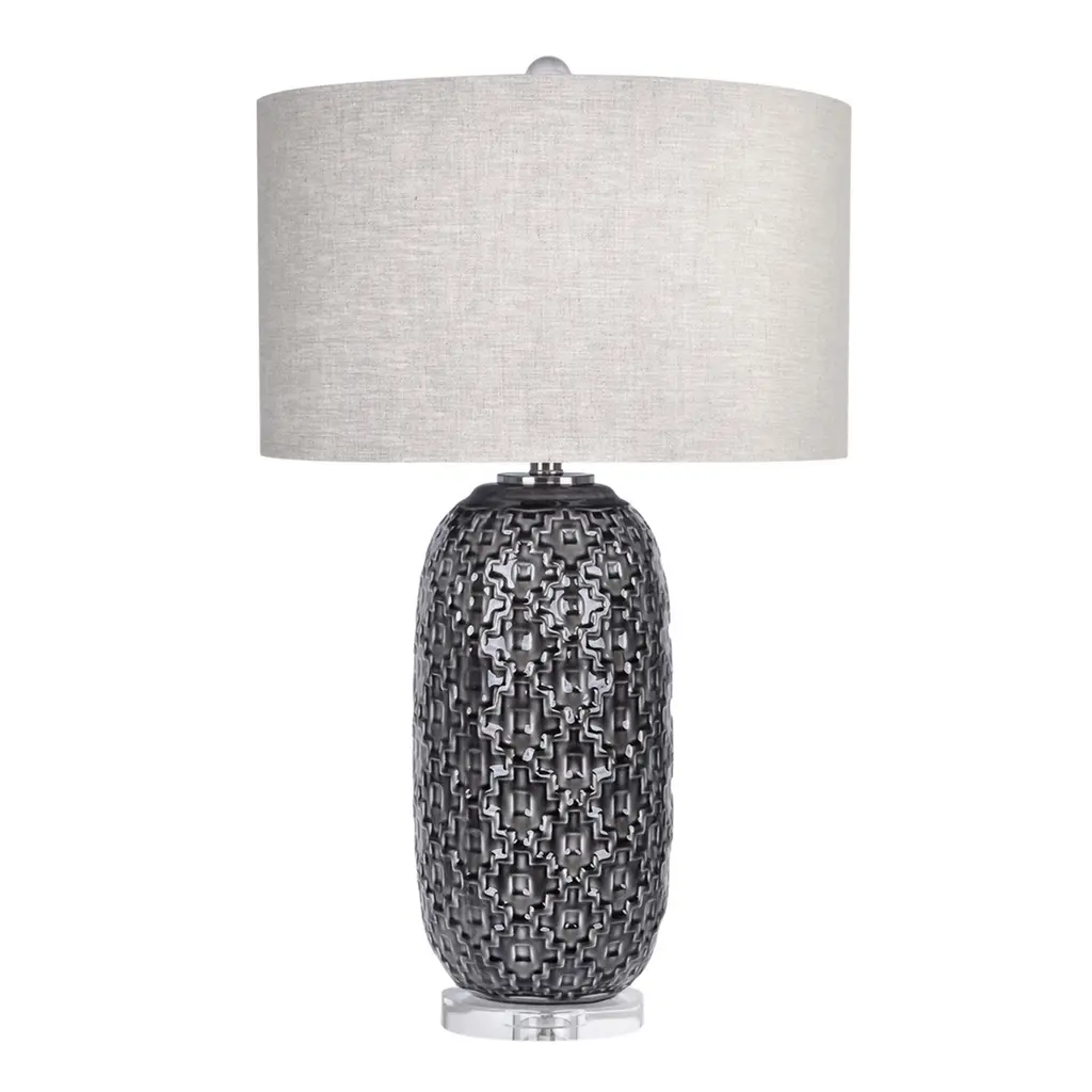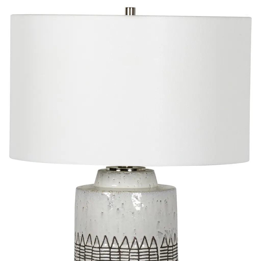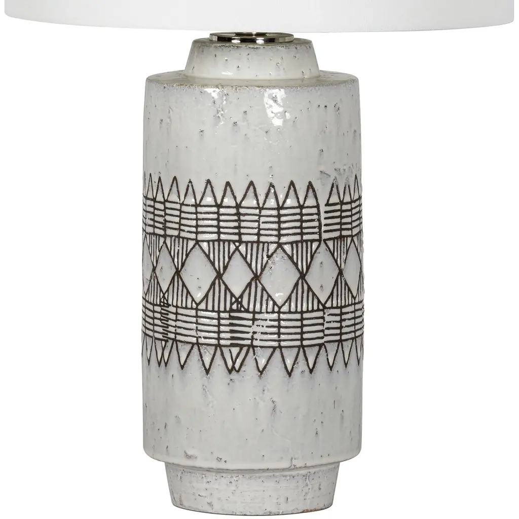 The intricate, ink-like pattern transversing the middle of the Zuri Ceramic Table Lamp was inspired by the ancient art form of henna. This unique ceramic piece brings to mind visions of distant lands and travel adventures.