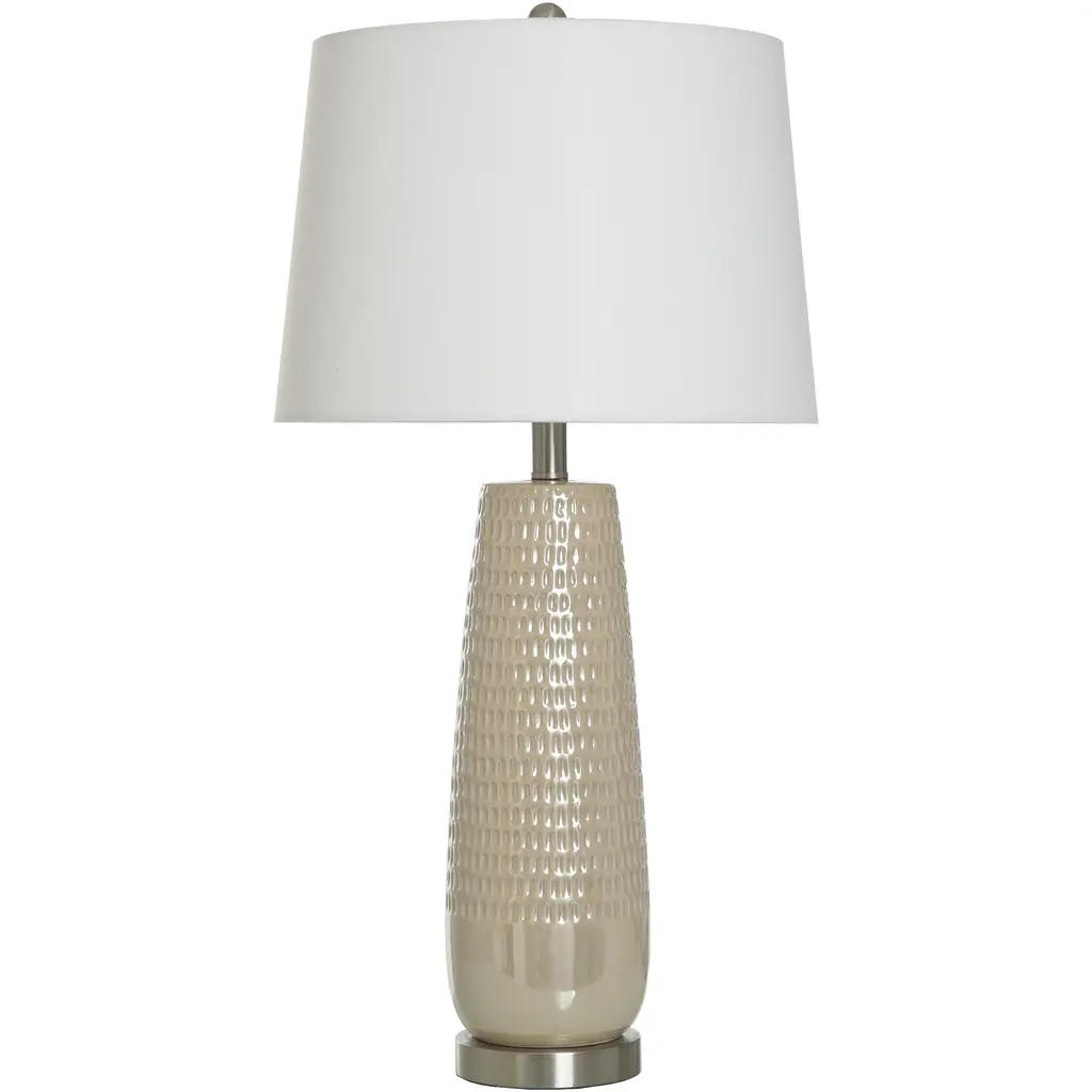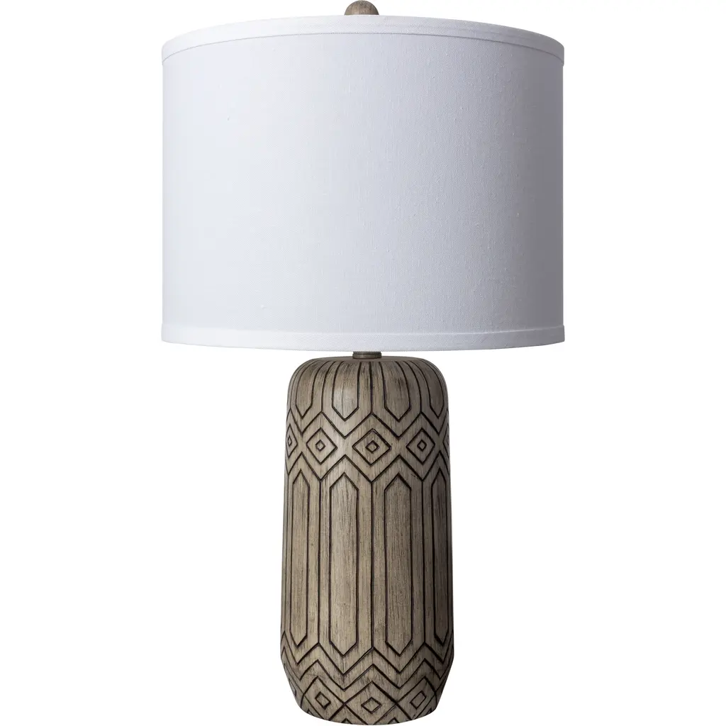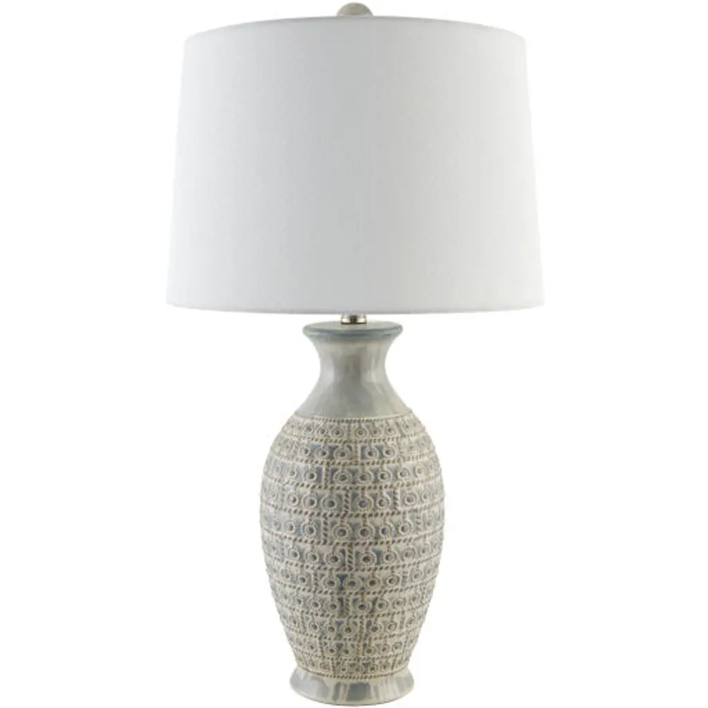 The intricate, ink-like pattern transversing the middle of the Zuri Ceramic Table Lamp was inspired by the ancient art form of henna. This unique ceramic piece brings to mind visions of distant lands and travel adventures.