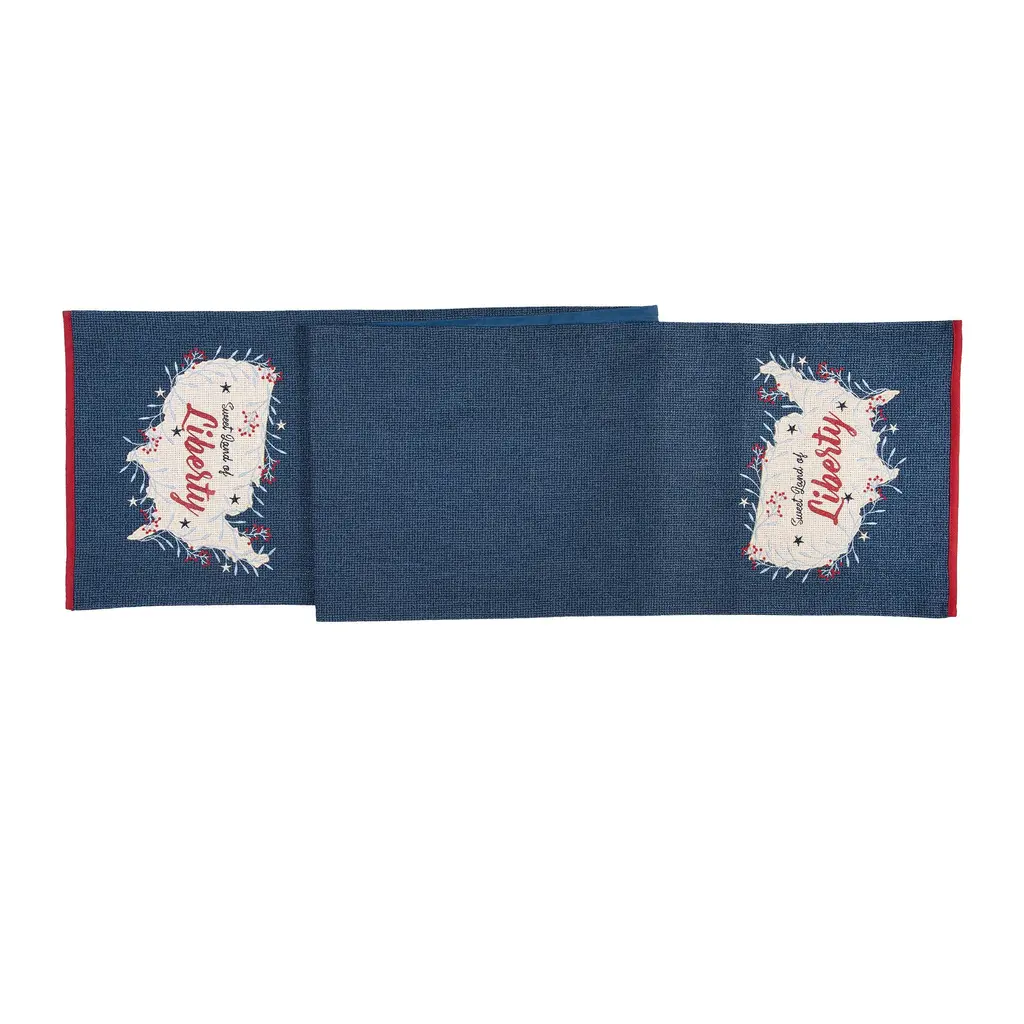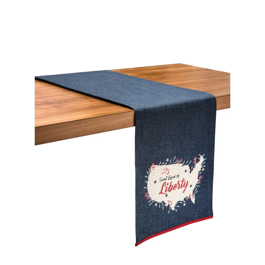 Celebrate the land you love with this patriotic red, white, and blue table runner. With an applique outline of the USA and embroidered accents, the Liberty Runner is perfect for a Fourth of July barbeque, a Memorial Day party, or for everyday Americana style.