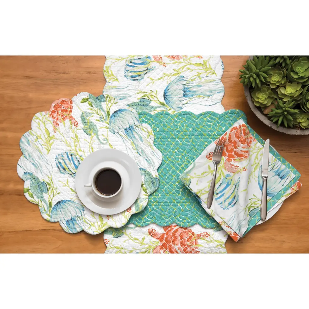 Transform your home with the stunning color tones of the Adriatic Sea. Flourished motifs forming medallions reminiscent of vintage Mediterranean tiles creates an inviting pattern that imbues every inch of fabric with vitality. Pair the Madison Adriatic tabletop collection from Tag Living by C&F Home with bold accents to create a dynamic contrast that celebrates the vibrant energy of the Mediterranean coast. Reversible to a coordinating medallion lattice pattern for additional styling options. Crafted of cotton and machine washable for easy care. Love this pattern? Madison Adriatic is also available in our bedding collection and ruffled valance.Runner measures 51" longFlourished motifs forming medallions reminiscent of vintage Mediterranean tilesCrafted of 100% Cotton