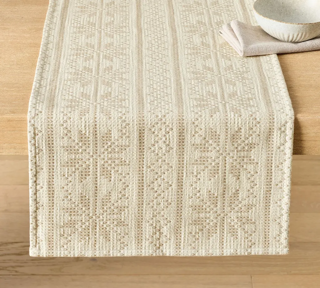 Add a touch of rustic charm to your dining space with this farmhouse-style table runner in white and beige hues. This rectangular table runner features a classic gingham pattern in warm beige tones and crisp white. This piece is accented with box and ray-stitching enhancing its cozy, farmhouse appeal. Features: Rectangular table runner Farmhouse gingham pattern in shades of beige and white Adorned with coordinating box-stitch stripes Beige ray-stitch trim on both ends with seamless side hems Made with 100% cotton Suitable for tables that can seat 4-6 people Care instructions: machine wash in a gentle cycle, tumble dry low, low iron if needed Recommended for indoor use Dimensions: 14" wide x 72" long Material(s): cotton