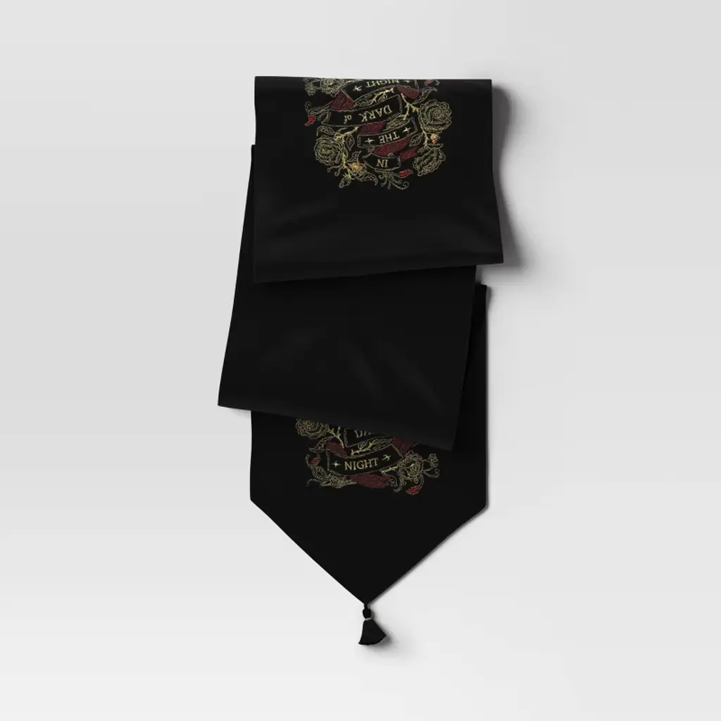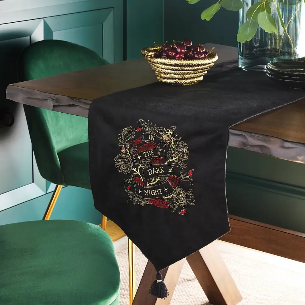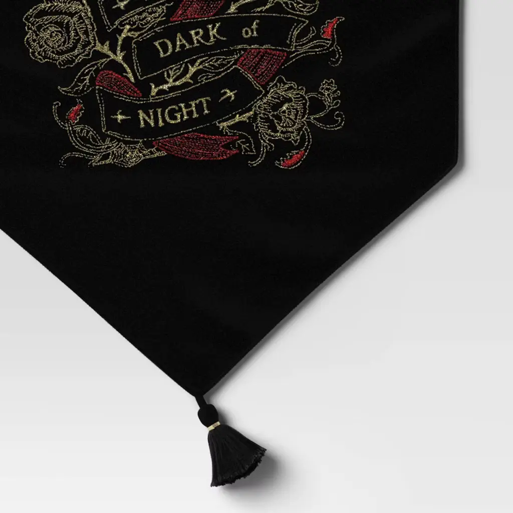 This 72-Inch x 14-Inch Embroidered Velvet Table Runner from Threshold™ adds a cool look to your tablescape. Made from polyester velvet fabric for a soft feel, this black table runner features gold-and-red rose embroidery plus embroidered "Dark of Night" text. Great for Halloween dining, it also has a single tassel on each end plus cotton backing to help prevent slipping.Threshold™: Looks like home, feels like you.