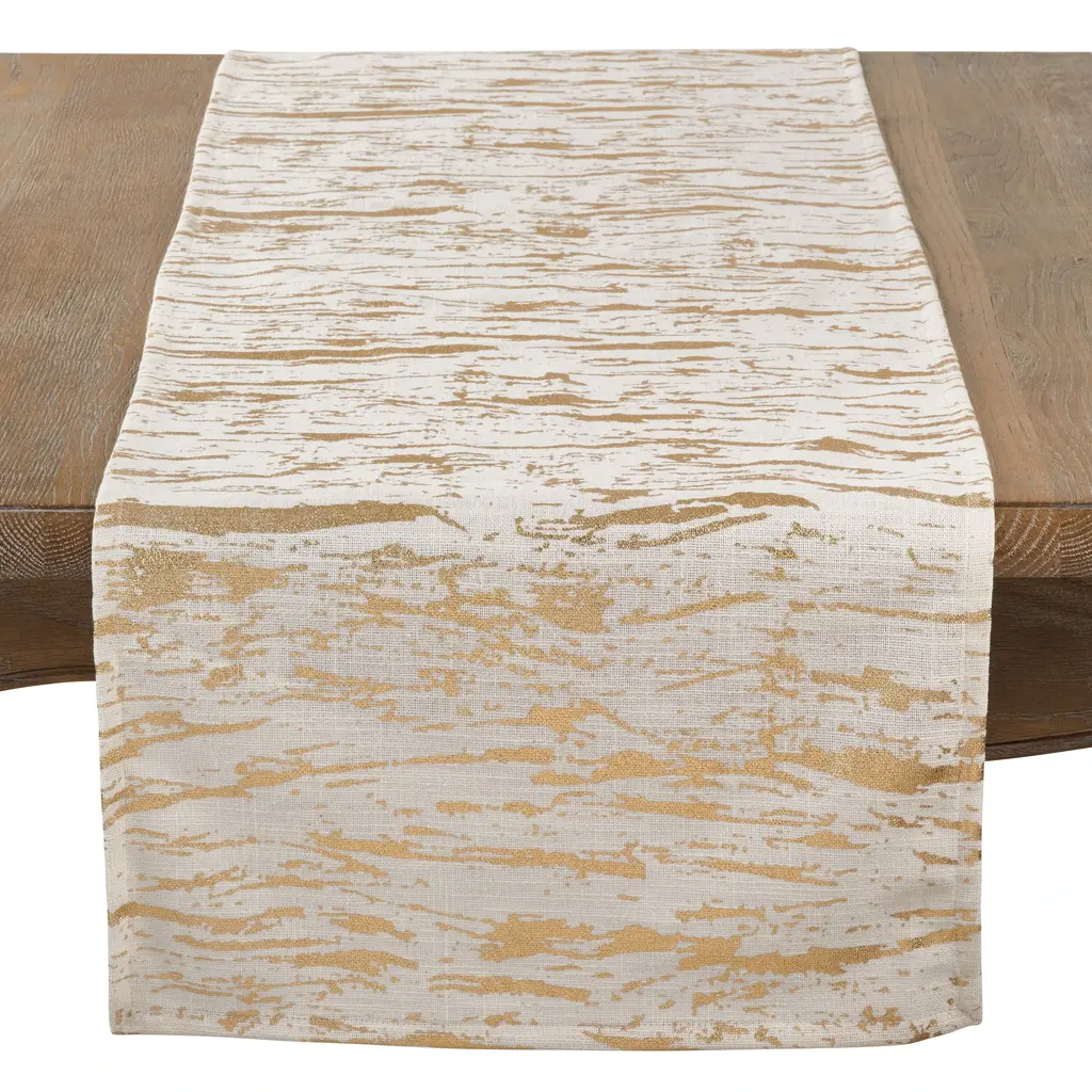 A unique distressed design gives this stylish cotton table runner an ultra glam appeal. The Distressed Foil Print Table Runner is perfect to dress up your tablescape for a special occasion without overreaching. Pair with metal charger plates and solid color dinnerware.Features: