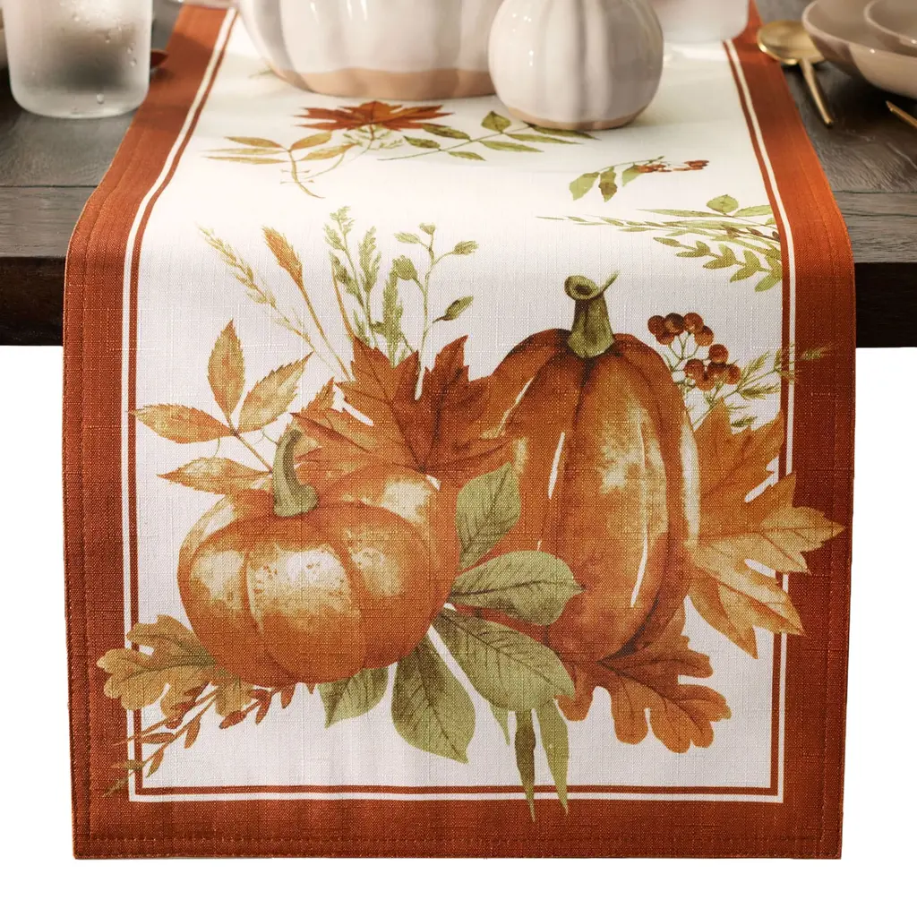 The Autumn Pumpkin Grove printed table runner brings a festive note to your table setting throughout the Fall season. Inspired by the harvest, this table runner is decorated with heirloom orange pumpkins, leaves and wheat in warm golden colors on a soft white ground and rust orange double border design. Excellent for special occasions, events, parties, family gatherings and everyday use during fall. Soft and durable fabric can be ironed to release stubborn creases and make your table runner wrinkle free. Hemmed edge adds a finished look and prevents wear and tear. Table runner measures 13x70. 100% Polyester. Easy care, machine washable. Coordinate to Autumn Pumpkin Grove tablecloth, napkins, placemats, kitchen tiers and valances to complete the look.