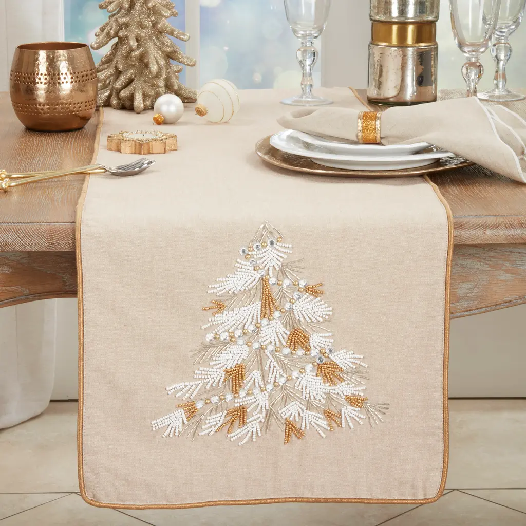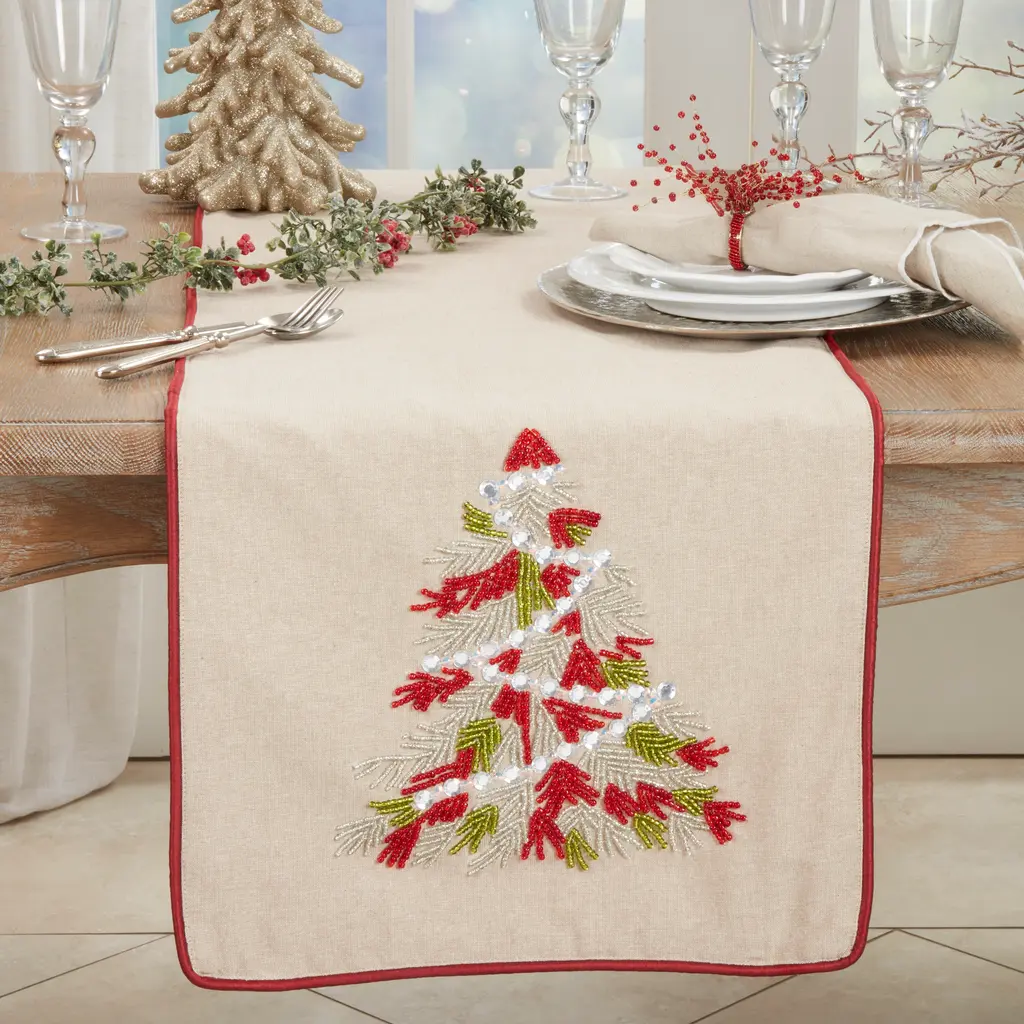 Add a cheerful note to your tabletop with this stunning beaded table runner. Featuring an ornate beaded Christmas tree design to bring the ideal festive touch for your holiday table. This table runner serves as a stylish and chic foundation to you place settings. Pair with solid placemats or napkins for a cohesive and complete look.