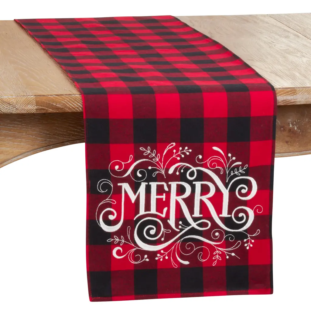 Ideal for entertaining guests or any holiday celebration, the Buffalo Plaid Merry Table Runner adds a delicate note to your decor. It features large test surrounded by delicate embellishments, which makes the design pop. Pair with solid color placemats and napkins.Features: