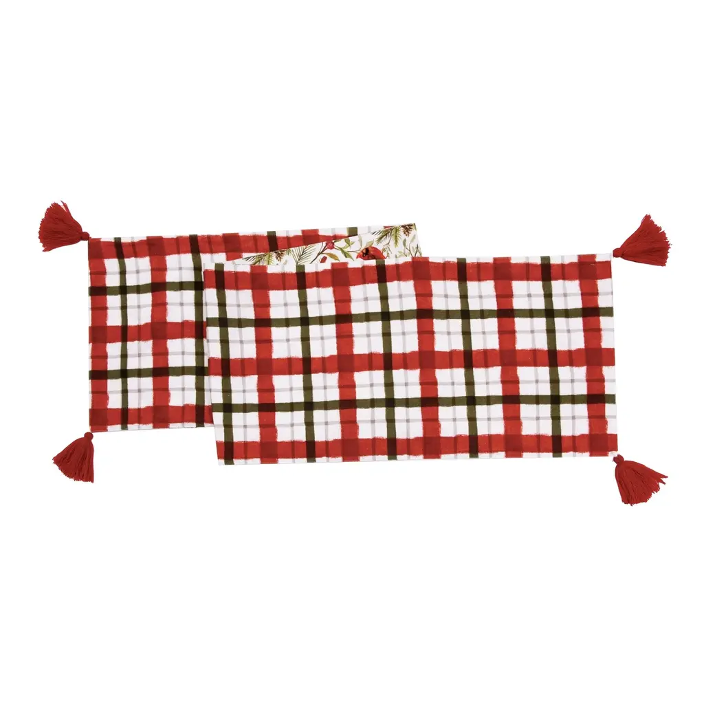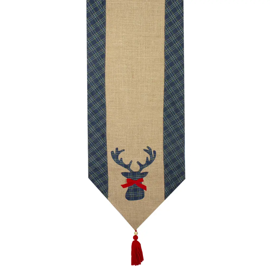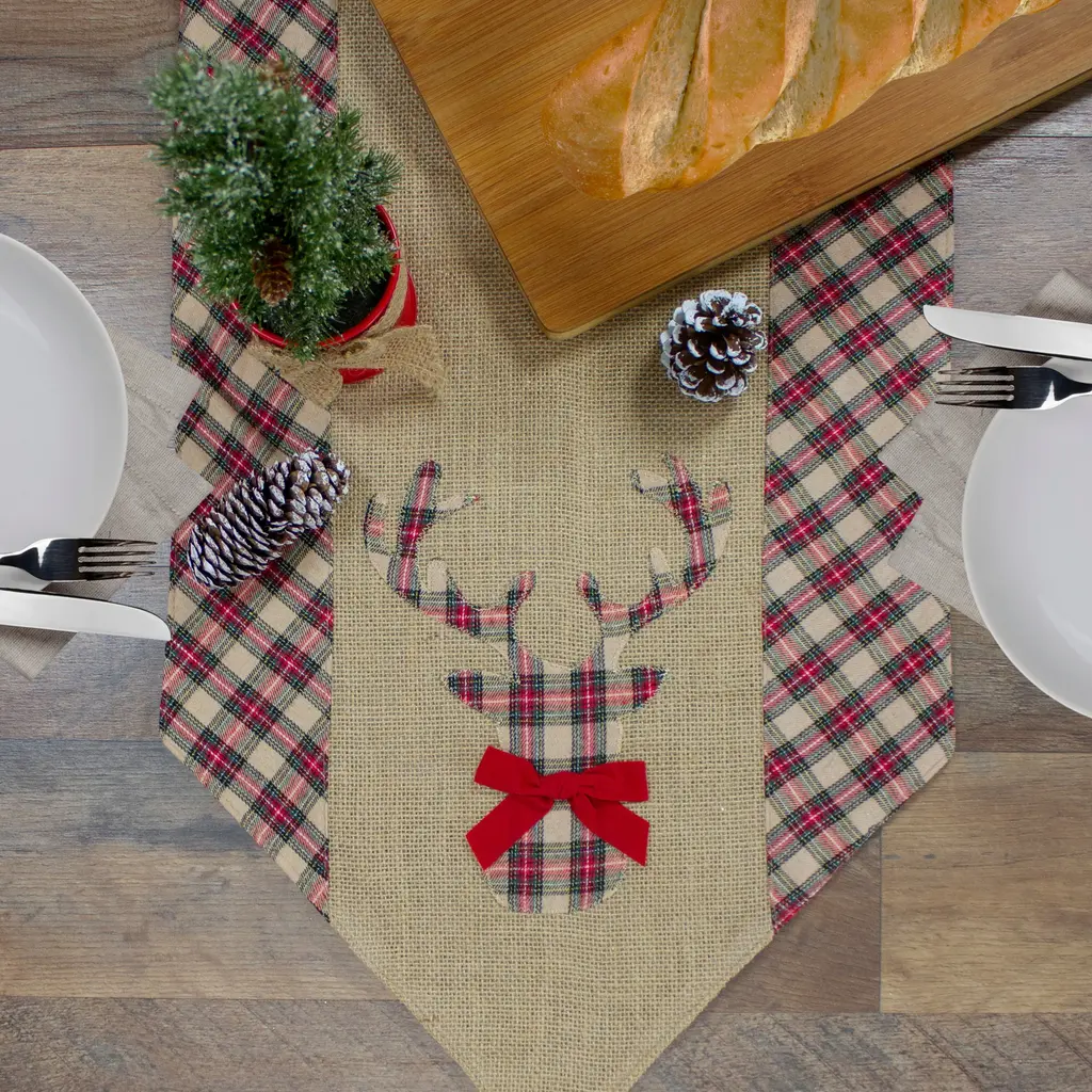 Celebrate a classic lodge Christmas with family and friends this year. Add some rustic charm to your holiday decor with this lovely table runner. The table runner is a burlap and red plaid reindeer design and has a red tassel on each end. Great for all kinds of holiday decorations including mantle displays, tabletops, centerpieces, and more! Product Features: Burlap and red plaid reindeer table runner Reindeer applique accents with red bows Red tassels with wooden bead on each end Recommended for indoor use only Care instructions: spot clean Dimensions: 36"H X 14"W X .5"D Material(s): polyester/burlap/wood