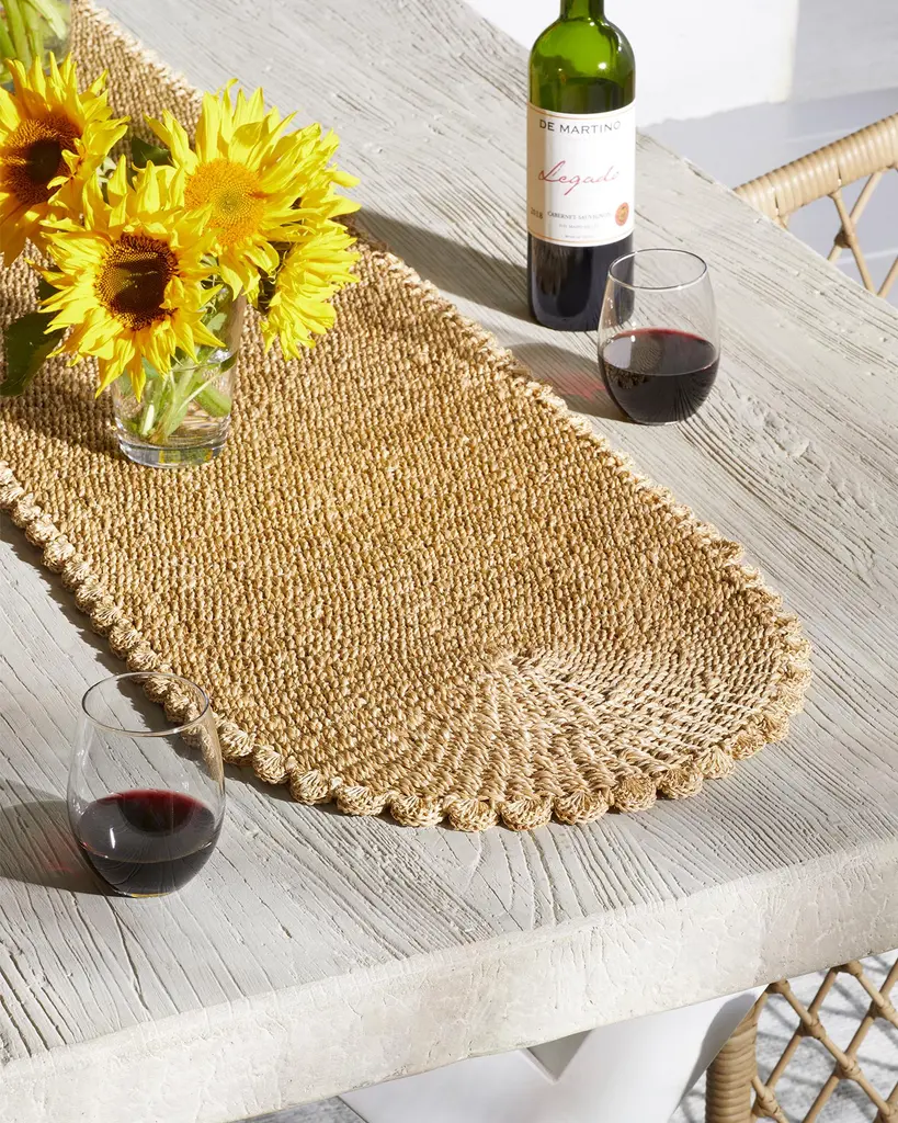This handwoven runner has plenty of natural charm, thanks to woven abaca and a scalloped edge. It lends a certain flair to your get-togethers -- but is casual enough for weeknight meals, too.