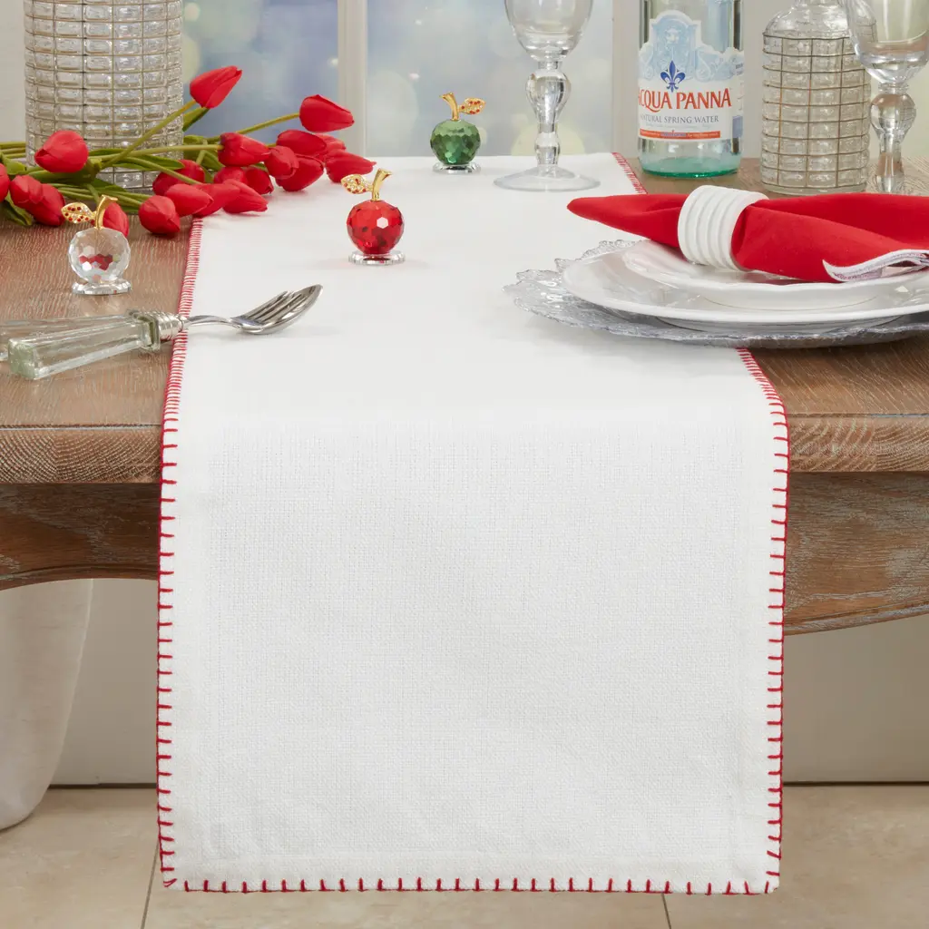 Celena Collection Whip Stitched Design Cotton Table Runner - White/red - 13"x72"