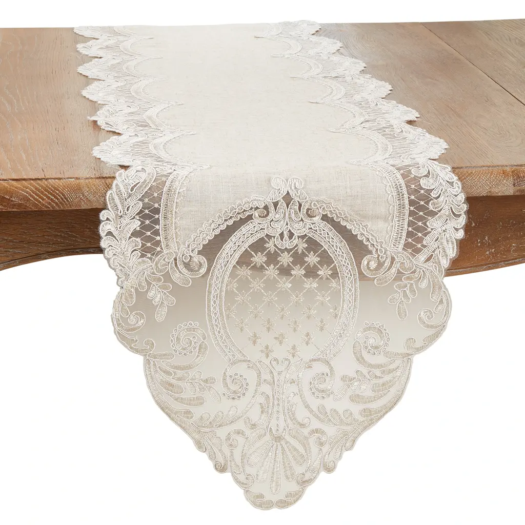 Elevate your table with this Embroidered Lace Table Runner. Delicate and intricate, it adds an elegant touch to any occasion. Crafted with meticulous embroidery, this runner brings timeless beauty to your dining experience, creating a sophisticated and inviting atmosphere.Features: