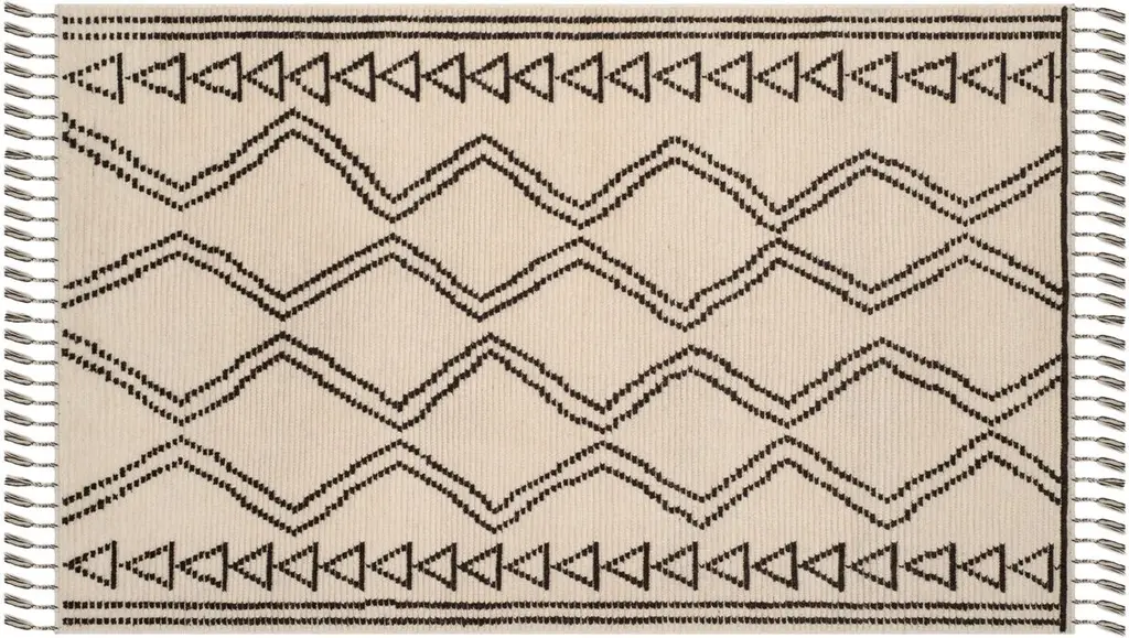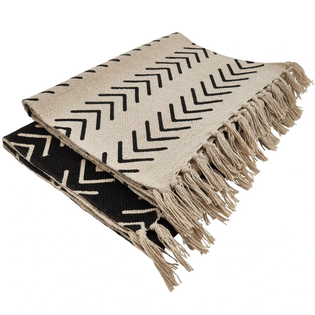Give your table some added charm with this chevron table runner. A white chevron pattern printed on a black background combines with the whimsical fringe design to create this simple yet charming table runner. Perfect for turning up the style on your dining room table during any season or for any holiday, this cotton tablerunner is soft and durable. It is ideal for everyday use or dinner parties and is machine washable for quick and effortless cleaning between uses and as needed.Features:Material: 100 percent cottonProduct care: cold machine wash seperately, do not bleach, do not tumble dry, medium ironDesign is not reversible, 3 inches long fringeRunner has no liningCotton is soft and durable for daily use and regular laundering