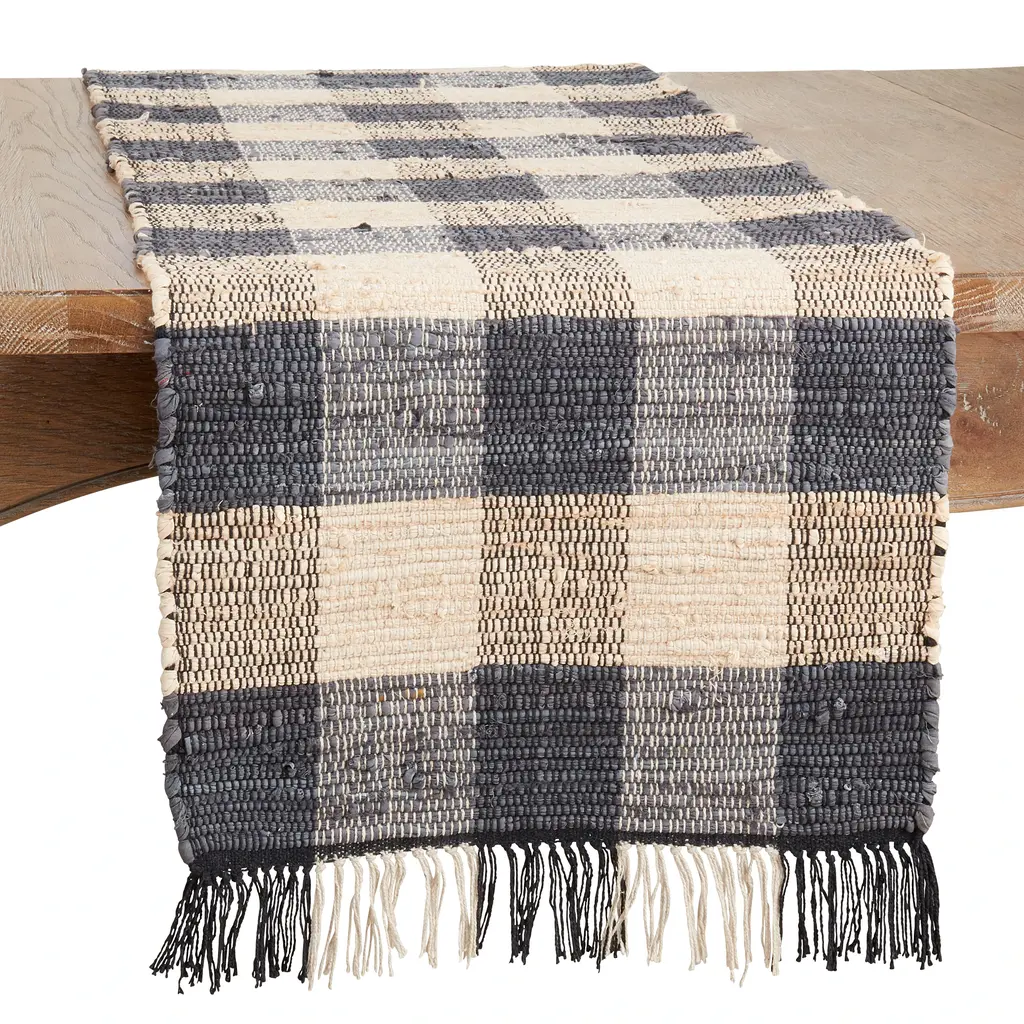 Featuring a classical checkered design, this chic, casual Checkered Chindi Table Runner adds warmth and texture to the tabletop. It's highly versatile and easy to pair with a wide range of dinnerware and other table linens. The chindi construction lends a natural look and feel, while the quality cotton adds softness.Features: