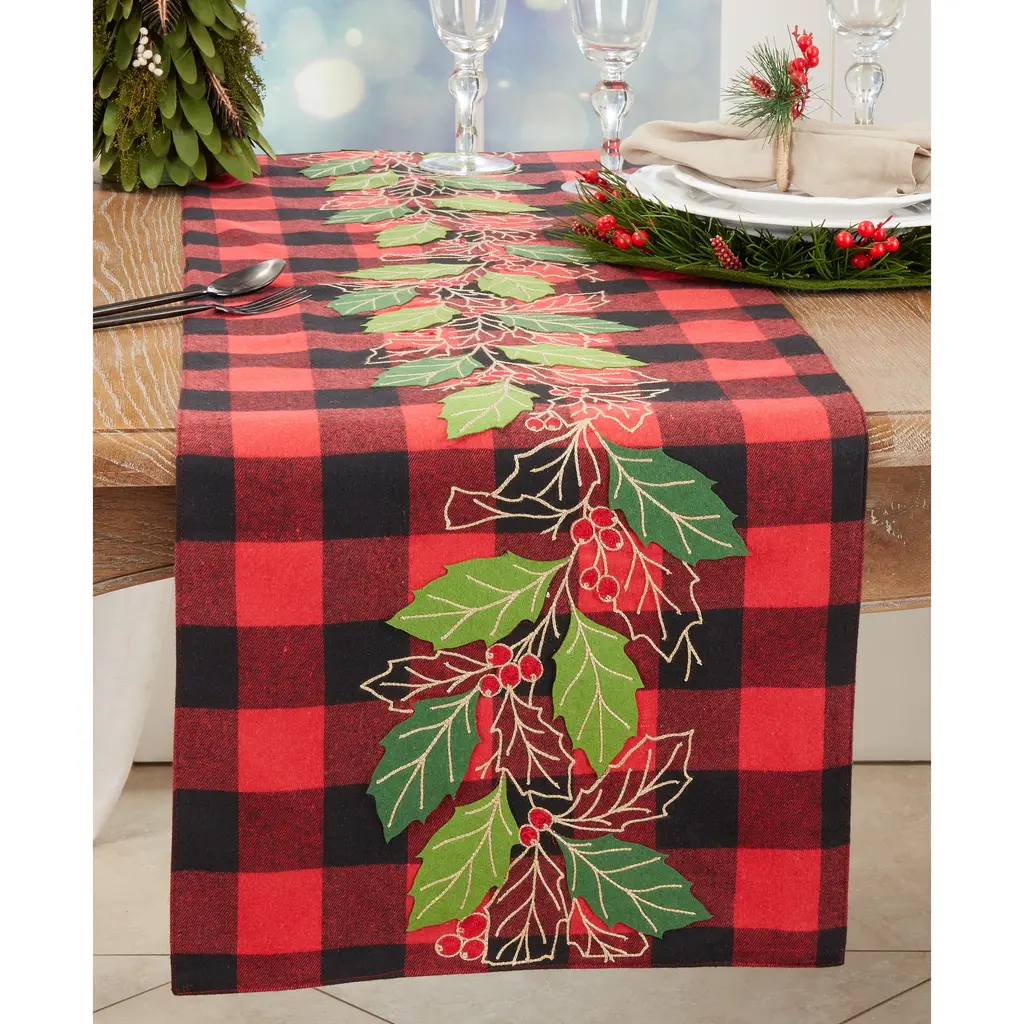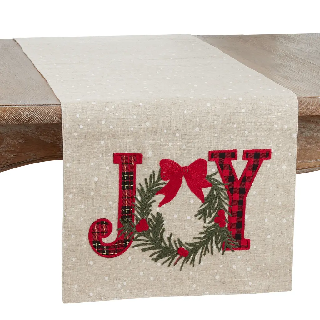 Add a cheerful note to your holiday table décor with this stylish Joy Design Table Runner. Featuring a familiar seasonal phrase with a wreath letter "O" and plaid "J" and "Y", this whimsical design will certainly bring smiles to your holiday table. With the subtle snowflake background, it's a great accent for your Christmas dinner table.Features: