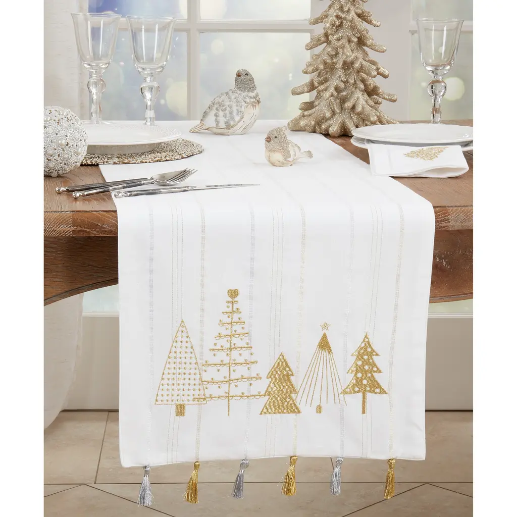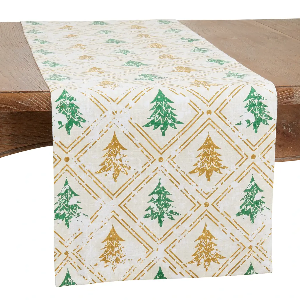 The Christmas Trees Design Table Runner is the perfect backdrop for your holiday meals, especially celebrations and special occasion. It features a rich pattern with golden accents that elevate the style of your tabletop. You can easily pair the cotton runner with matching placemats and table napkins to achieve a coordinated look.Features:
