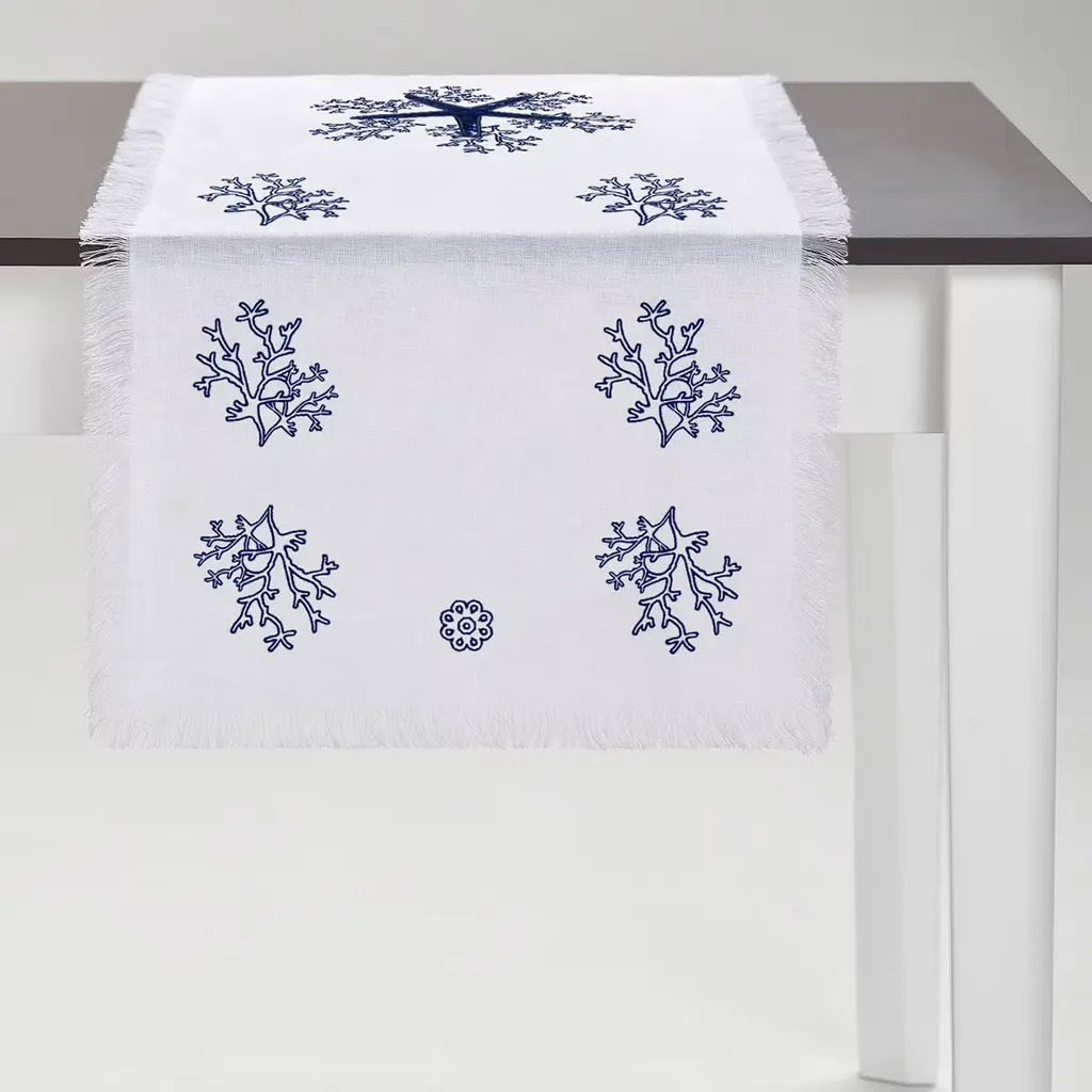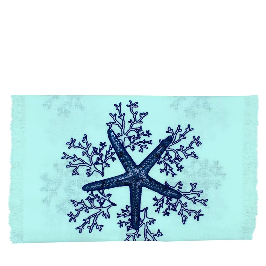 Sewn from prized Masters of Linen-certified white linen, this elegant fringed runner is an ode to underwater wonders. The refined embroideries in fine blue Mako cotton trace the profiles of intricate corals and a starfish, a pattern resulting from several hours of patient manual embroidering. Embellished with delicate applications of spangles, the design is also available in different colors.