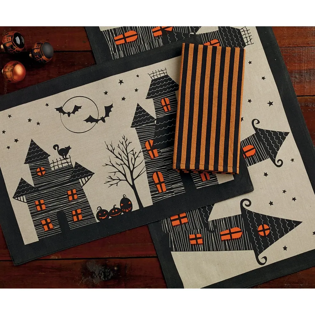 DII has wonderful, high quality decorative table runners available for any season and any occasion. Our 100% cotton spooky Haunted House table runner is perfect to decorate your tabletop for Halloween dinner parties and frighten your guests. Table runner is 14 x 72", 100% cotton. Care instructions: Hand wash cold, line dry and low iron if needed.