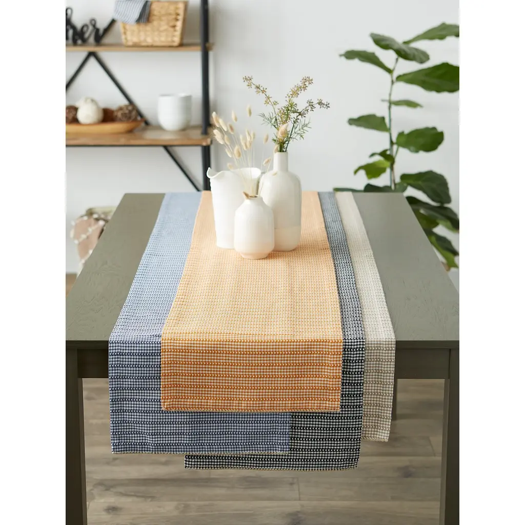 DII offers a full collection of trend-based designs for all seasons. Incorporating the hottest colors and themes, DII brings you a fresh, innovative line of kitchen products, tabletop, gifts, and home decor for every season, every holiday and everyone.Measures 14x72", appropriate for a table that can seat 4-6 people 100% cotton fabric, machine wash with cold water on gentle cycle & tumble dry low; Do not bleach them or run them through a hot dryer. Our table runners are available in an assortment of colors and coordinate with our dishtowels, aprons, oven mitts, pot holders, napkins, and tablecloths : own the whole collection. Our table runner can spruce up dining, foyer, console or coffee tables while still showing off the surface of furniture