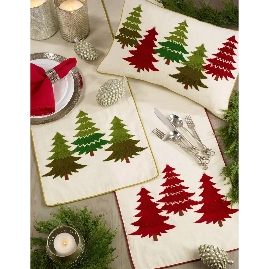 Decorate your table for the holidays with this cheerful table runner. Embroidered green and red Christmas trees against a white background fit right in with the holiday season, and a 100-percent cotton construction makes the runner both soft and easy to maintain with spot cleaning. Features: