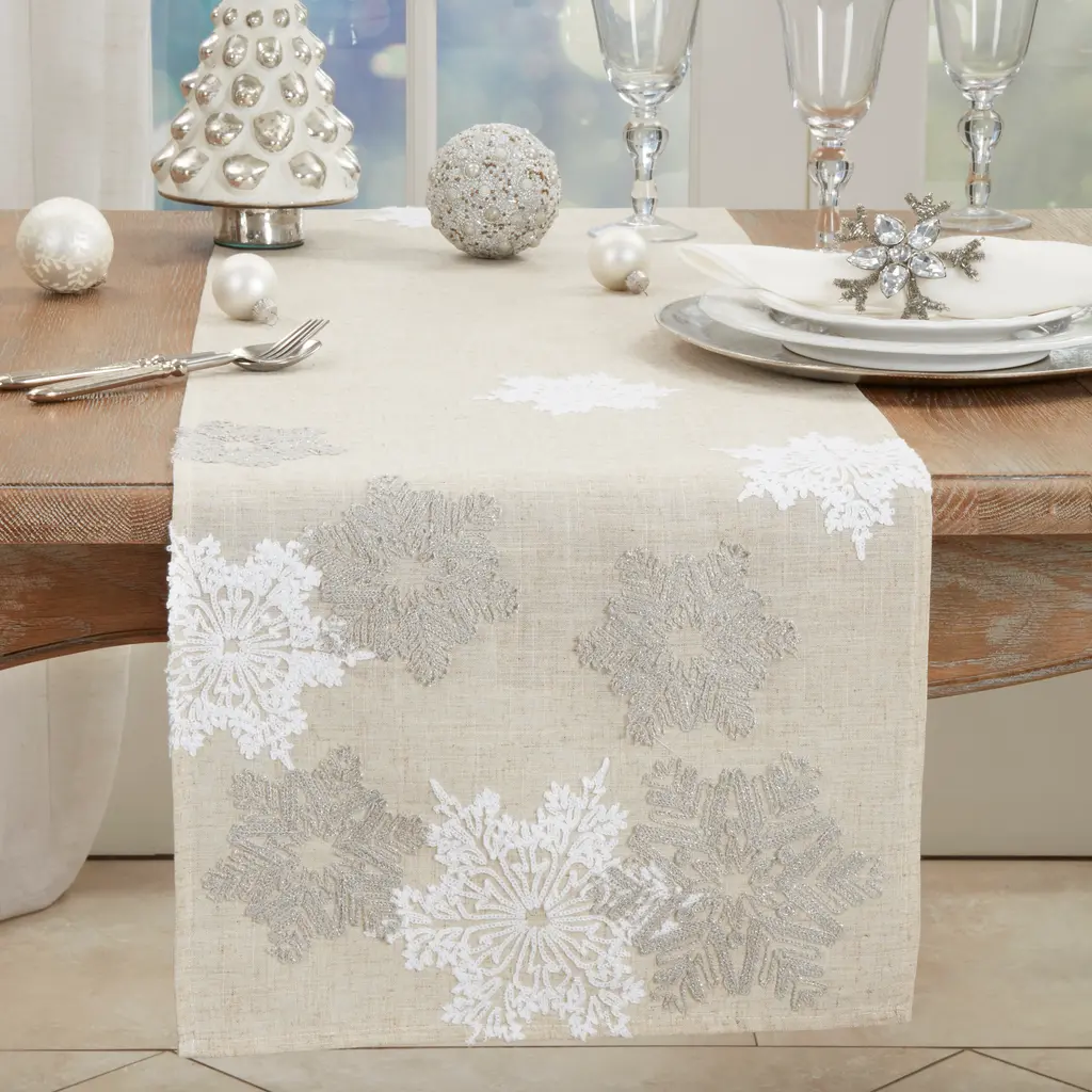 Bring a stylish, lovely touch to your table decor with this pretty Embroidered Snowflake Design Table Runner. It will help you create a beautiful decor without becoming too pretentious. The perfect backdrop for holiday meals and dinner parties, the table runner is easy to pair with linen placemats and table napkins.