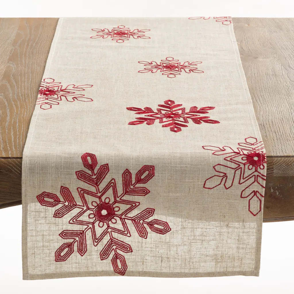 Featuring large embroidered snowflakes against a clean background, this Christmas table runner adds a gorgeous foundation for your table. The simple design and modern colors make it easy to pair with a wide range of dinnerware and table decor. Complete the look with coordinating placemats and dinner napkins. Made with 100% polyester for added durability and easy care.