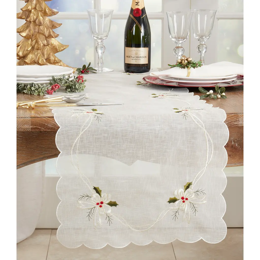 Set the perfect backdrop for special occasions and celebrations with this elegant and luxurious Embroidered Holly and Ribbon Table Runner. Its crisp white background instantly brightens the tabletop, while the delicate holly embroidery and the ribbon add texture and style. Pair the runner with matching placemats for a beautifully coordinated look.Features: