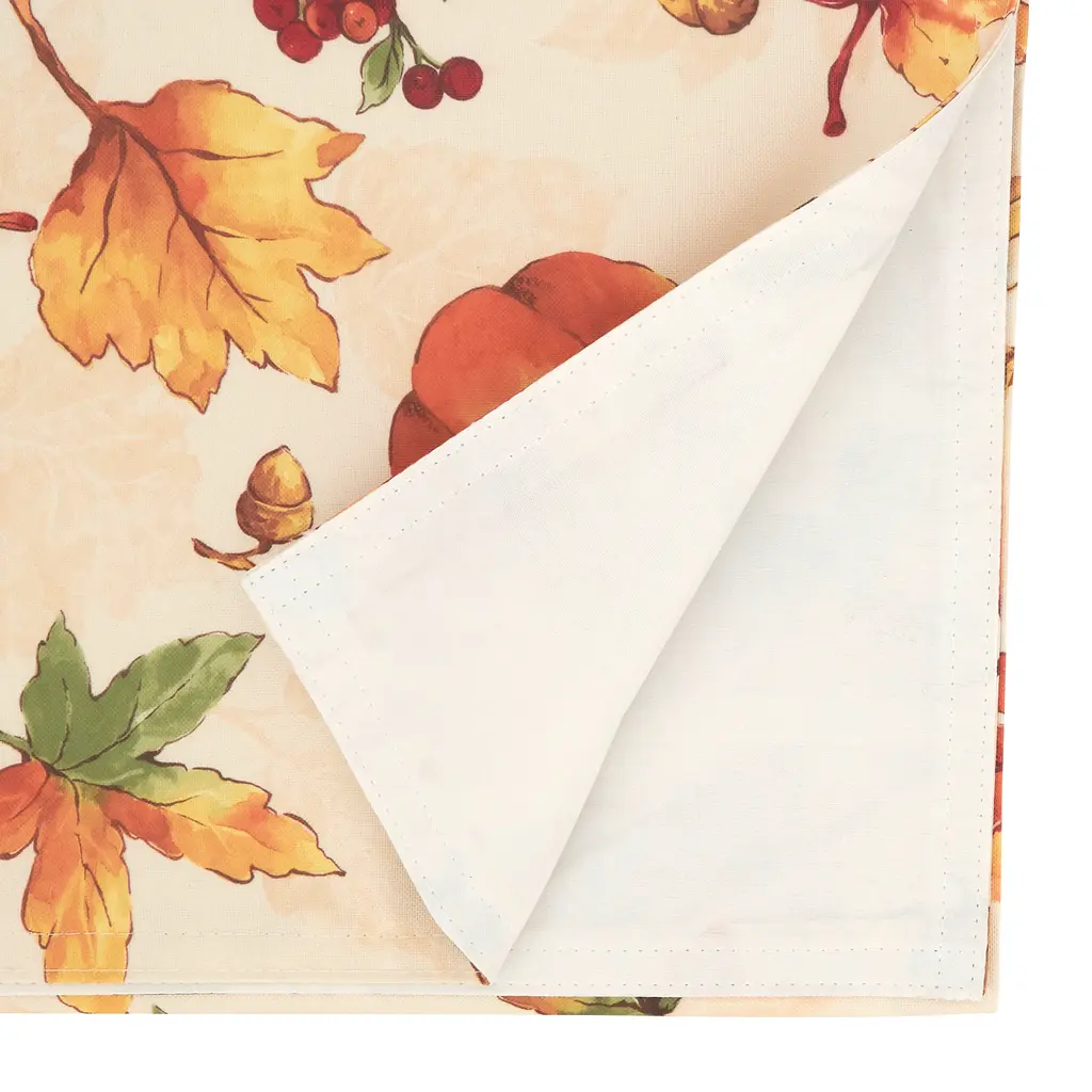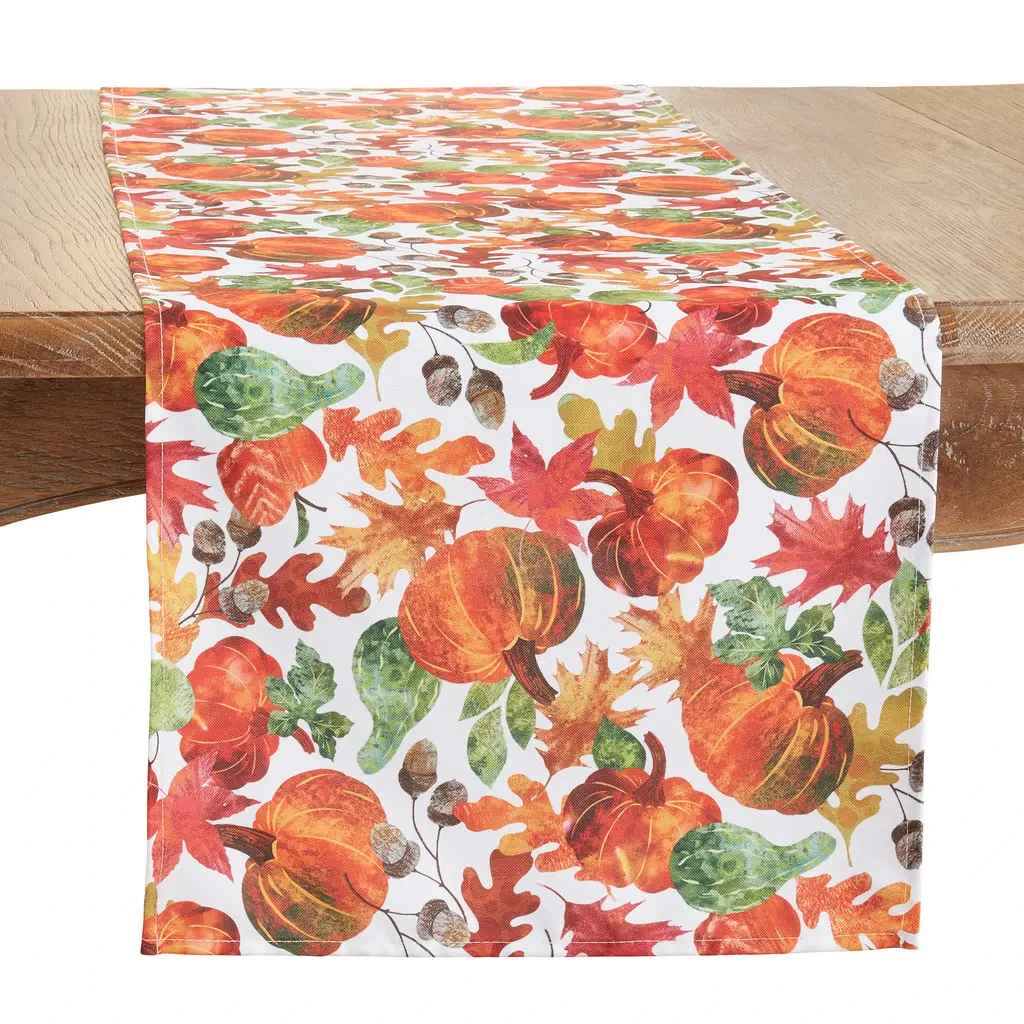 If you're looking to bring color and texture to your table décor, then this lovely Pumpkin Foliage Table Runner is the perfect backdrop for your tabletop. It features a rich pattern of pumpkins and autumn leaves in beautiful, deep shades of red, orange and green. You can easily pair it with solid colors within the same palette or with matching placemats.Features:
