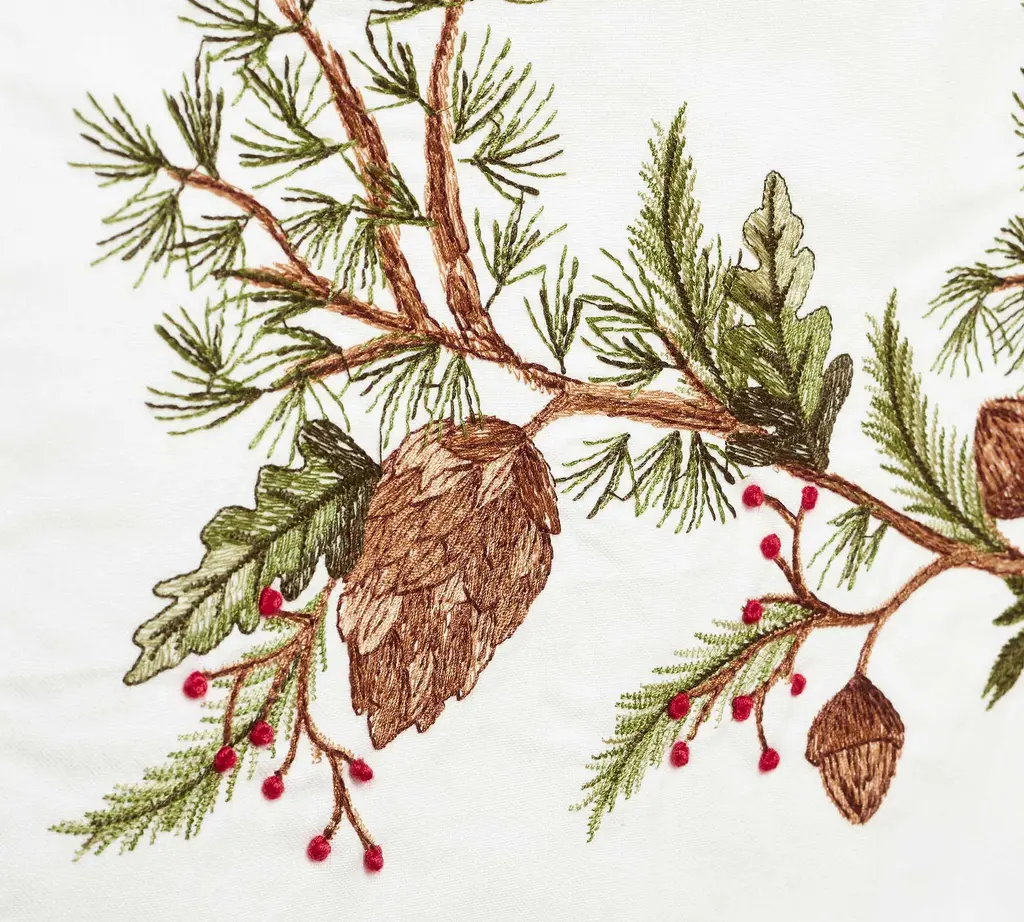 With natural tones and forest-inspired details, our festive table runner recalls the beauty and peacefulness one might find walking through a winter wonderland. Designed on machine-washable cotton, the down-to-earth elements come to life in rich, textural embroidery.