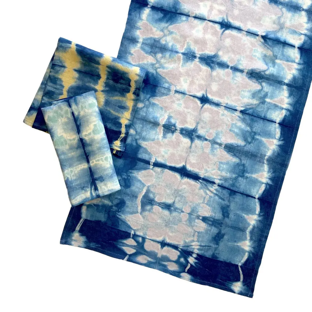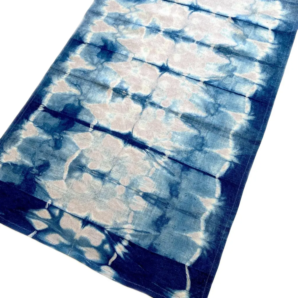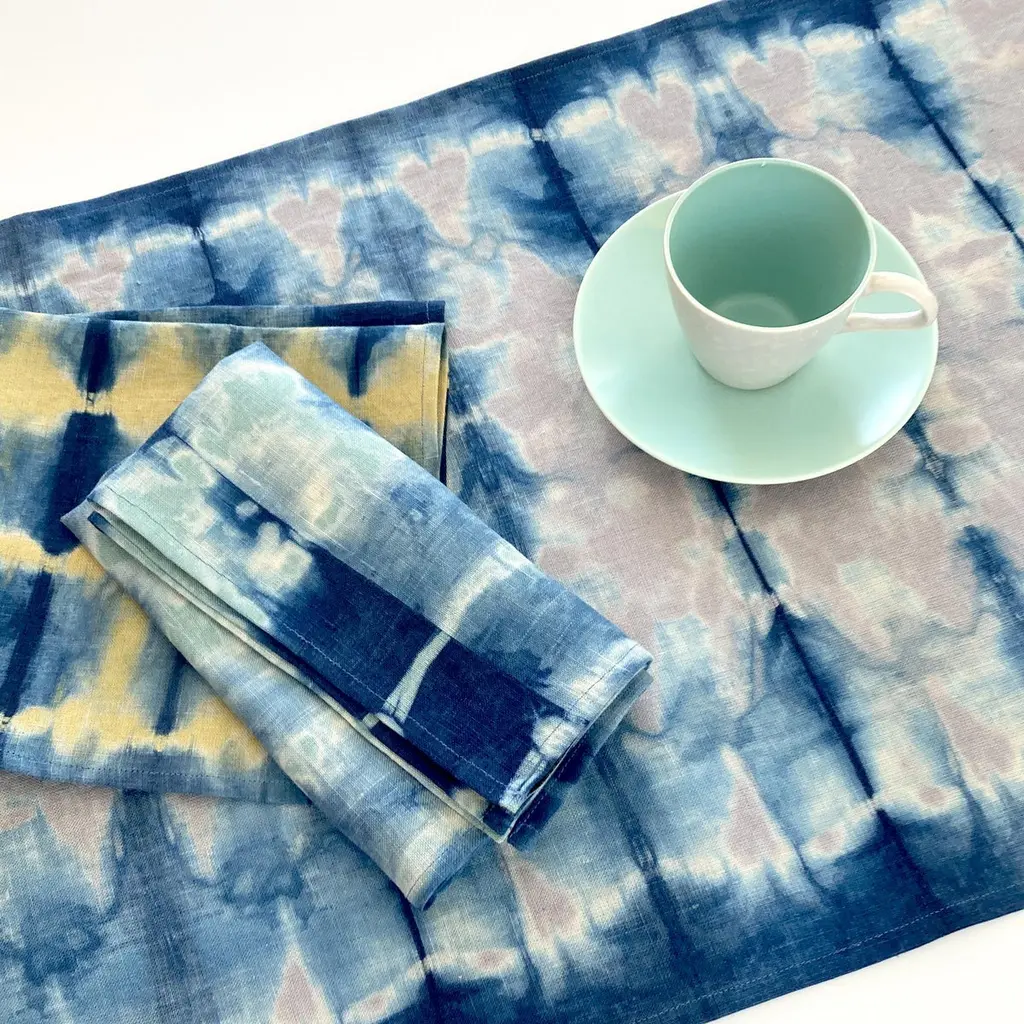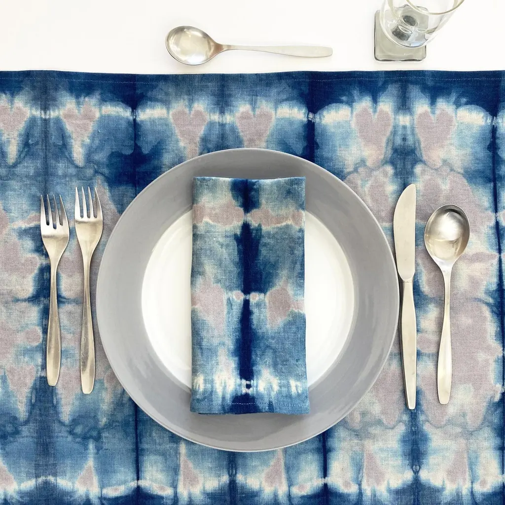 Silver gray linen table runner dyed with indigo in Pleat pattern. Sustainably hand-dyed and sewn in New York City. Runner measures approximately 18 x 72 inches. Each linen runner is hand dyed and one of a kind. Each linen panel is cut and folded by hand, in the shibori style, before it is dyed through a series of indigo dips. To achieve a rich blue color, each is dipped and oxidized several times, before setting, hand-washing and drying. Note: Slight variations may occur within the design. Care Instructions: Hand or machine wash cold on delicate cycle. Hang to dry.