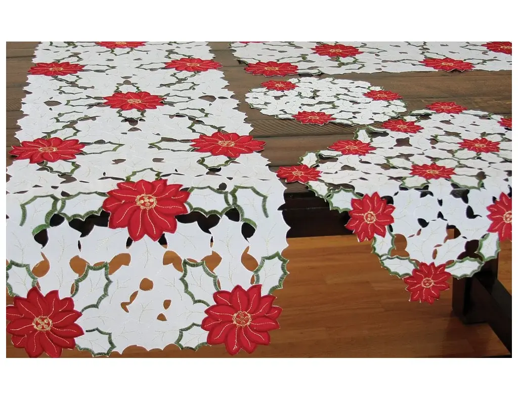 A classic Christmas pattern, it features lovely hand rendered cutwork and embroidered Holiday Poinsettias. This collection will make it a holiday season to remember. Machine wash cold water, no bleach, lay flat to dry. Steam iron as needed.
