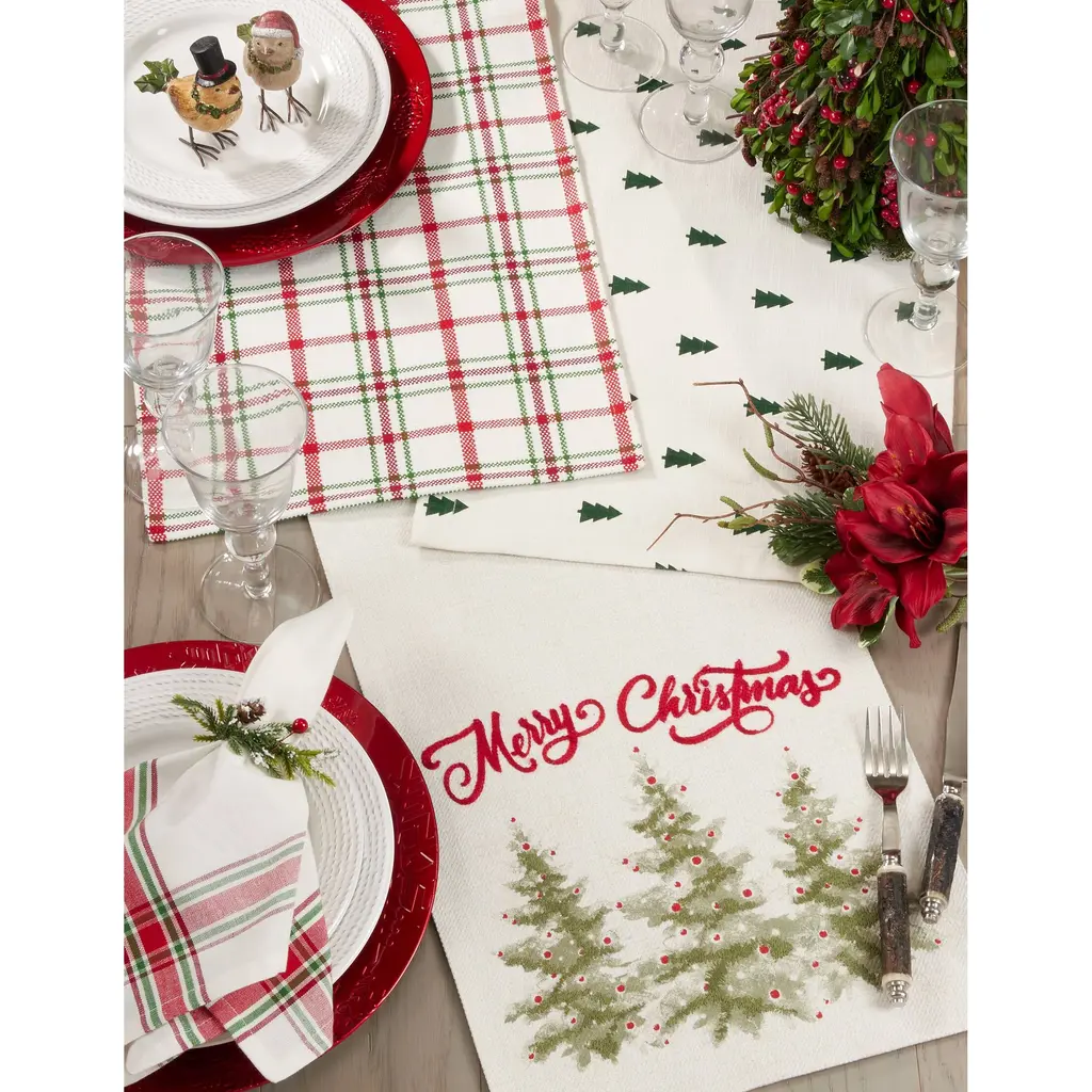 Featuring a light background and traditional Christmas design, this charming Christmas Tree Table Runner is the perfect backdrop for your holiday table. It works swell with both solid colors and patterns, and it can easily be dressed up or down depending on the occasion. Pair with matching placemats for a coordinated look.Features: