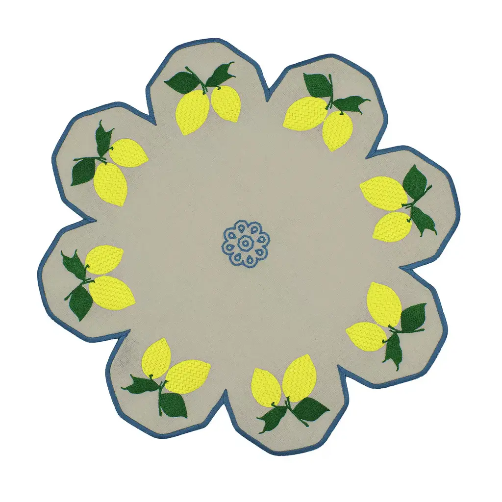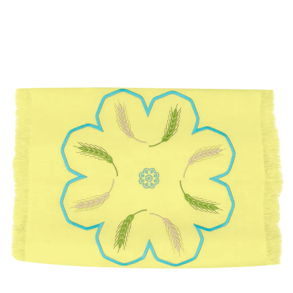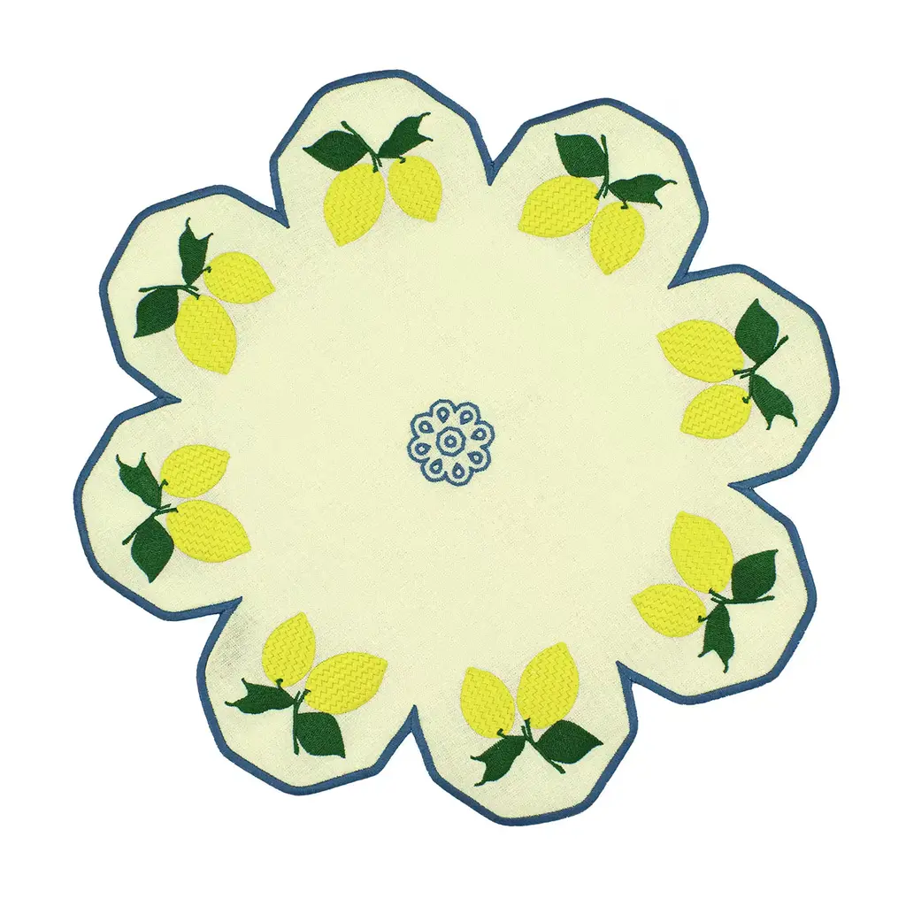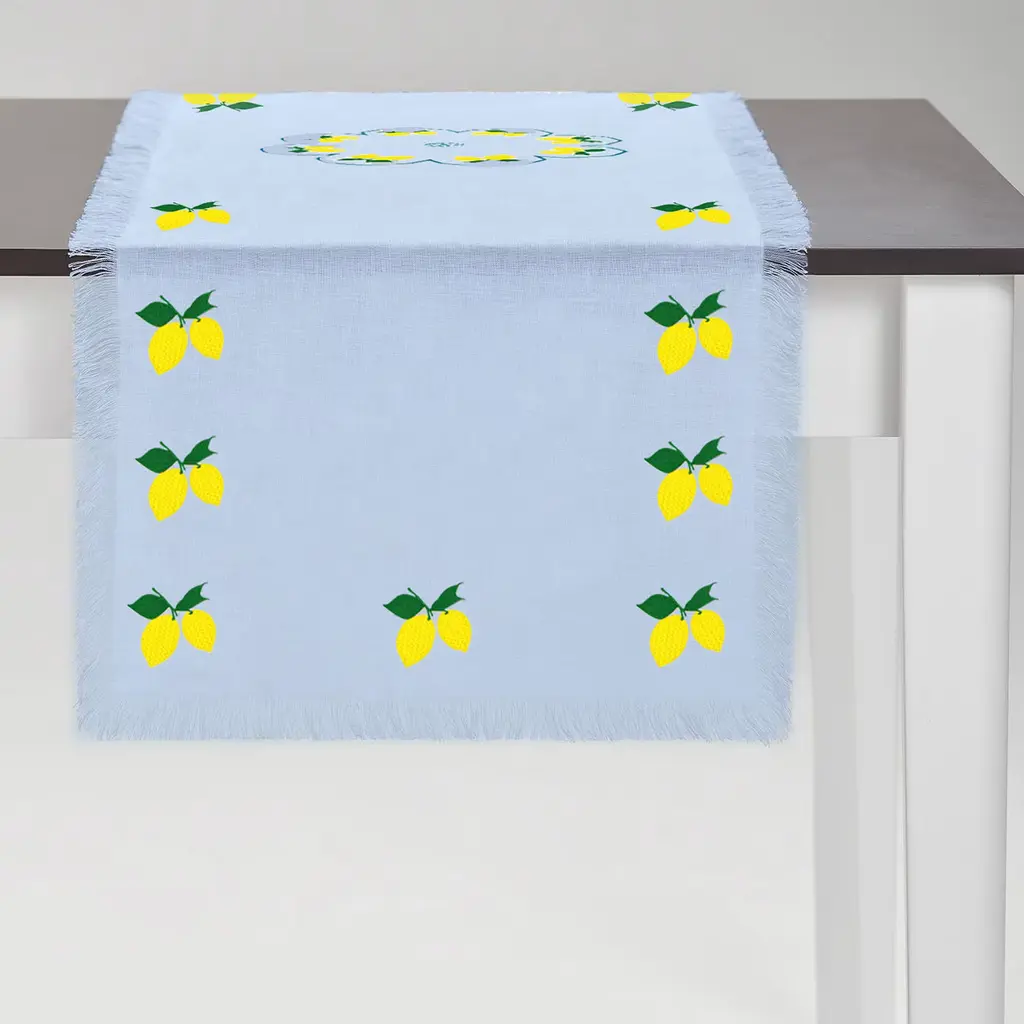This stunning and vibrant fringed runner in precious Masters of Linen-certified azure linen makes for the perfect solution for perking up otherwise dull tables. Minutely embroidered by hand in Mako cotton over multiple hours, the motif of lemons stands out for its detailing and for its intensely evocative charm. Different color options are available in the Artemest catalog.