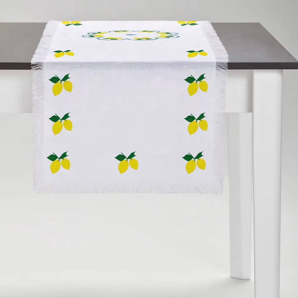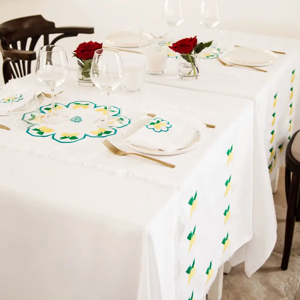 Fresh and elegant, this fringed runner was painstakingly embroidered by hand having sunkissed lemon groves in mind. Its bright weft in white Masters of Linen-certified linen gets contrasted by the vibrant hues of the fine Mako cotton of its embroideries that - obtained thanks to a patient process requiring multiple hours - strike with their minute beauty. More colors are available in the Artemest catalog.