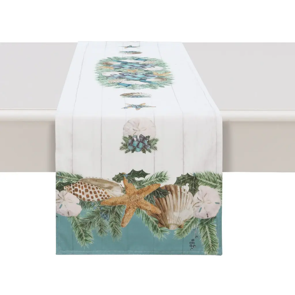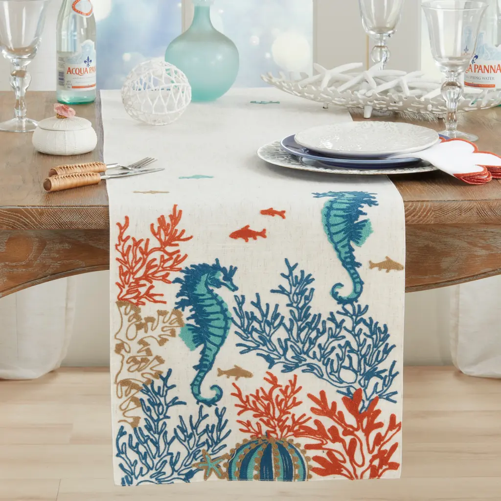 The Linen Blend Sea Horse And Coral Table Runner is designed to complement any setting with style. A great accent for your everyday or seasonal table.