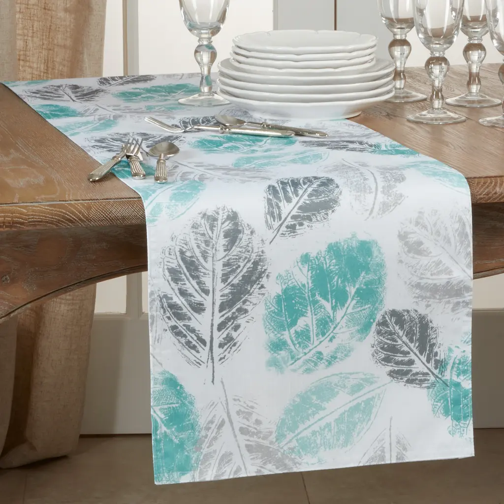 Trim your table in tropical style with this long runner featuring a fun leaf print. The loosely rendered images lend a breezy, casual feel to this piece, and the combination of grey and green tones on a crisp white backdrop add a serene vibe to your table. Use this runner to protect your table from drips and splashes while showcasing bamboo serving dishes or stacked ceramic dinnerware atop the nature-inspired pattern. Made of 100 percent polyester, this machine-washable runner holds up well to frequent use.Features:Material: 100 percent polyesterProduct care: warm machine wash, do not bleach, do not tumble dry, do not iron, dry clean recommendedDesign is not reversibleRunner has liningPolyester is a low wrinkle textile loved for being easy care