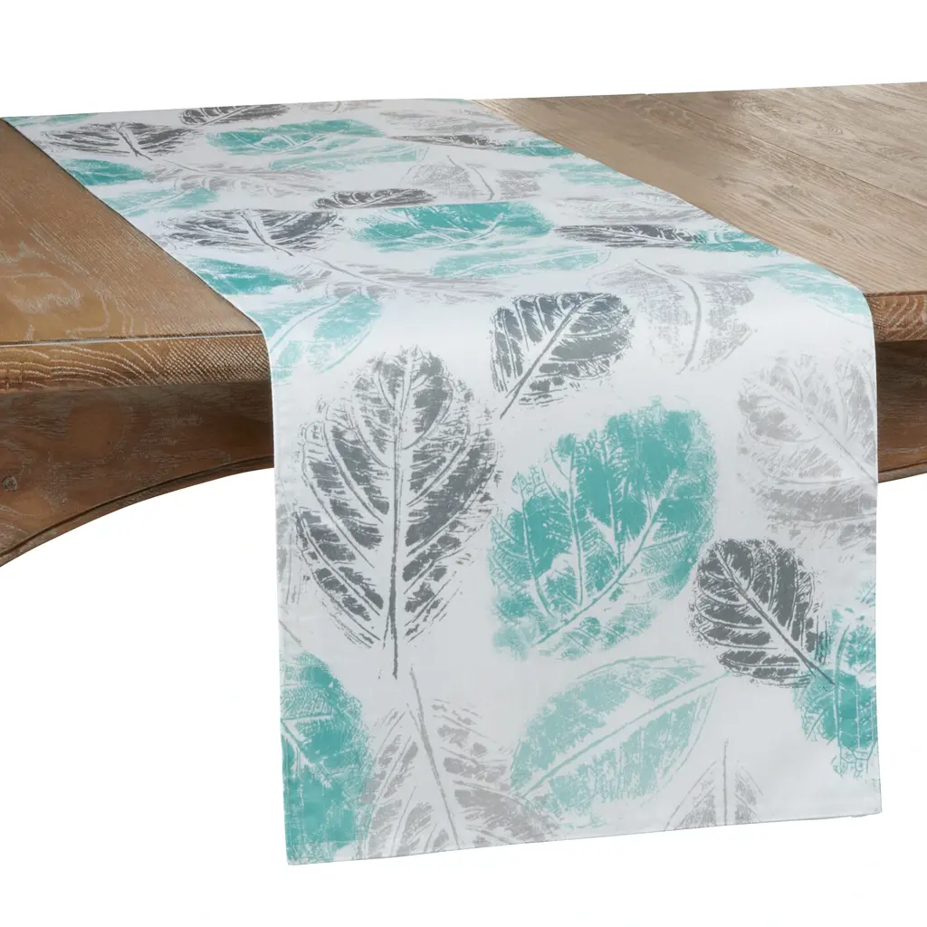 Trim your table in tropical style with this long runner featuring a fun leaf print. The loosely rendered images lend a breezy, casual feel to this piece, and the combination of grey and green tones on a crisp white backdrop add a serene vibe to your table. Use this runner to protect your table from drips and splashes while showcasing bamboo serving dishes or stacked ceramic dinnerware atop the nature-inspired pattern. Made of 100 percent polyester, this machine-washable runner holds up well to frequent use.Features:Material: 100 percent polyesterProduct care: warm machine wash, do not bleach, do not tumble dry, do not iron, dry clean recommendedDesign is not reversibleRunner has liningPolyester is a low wrinkle textile loved for being easy care