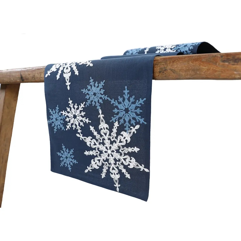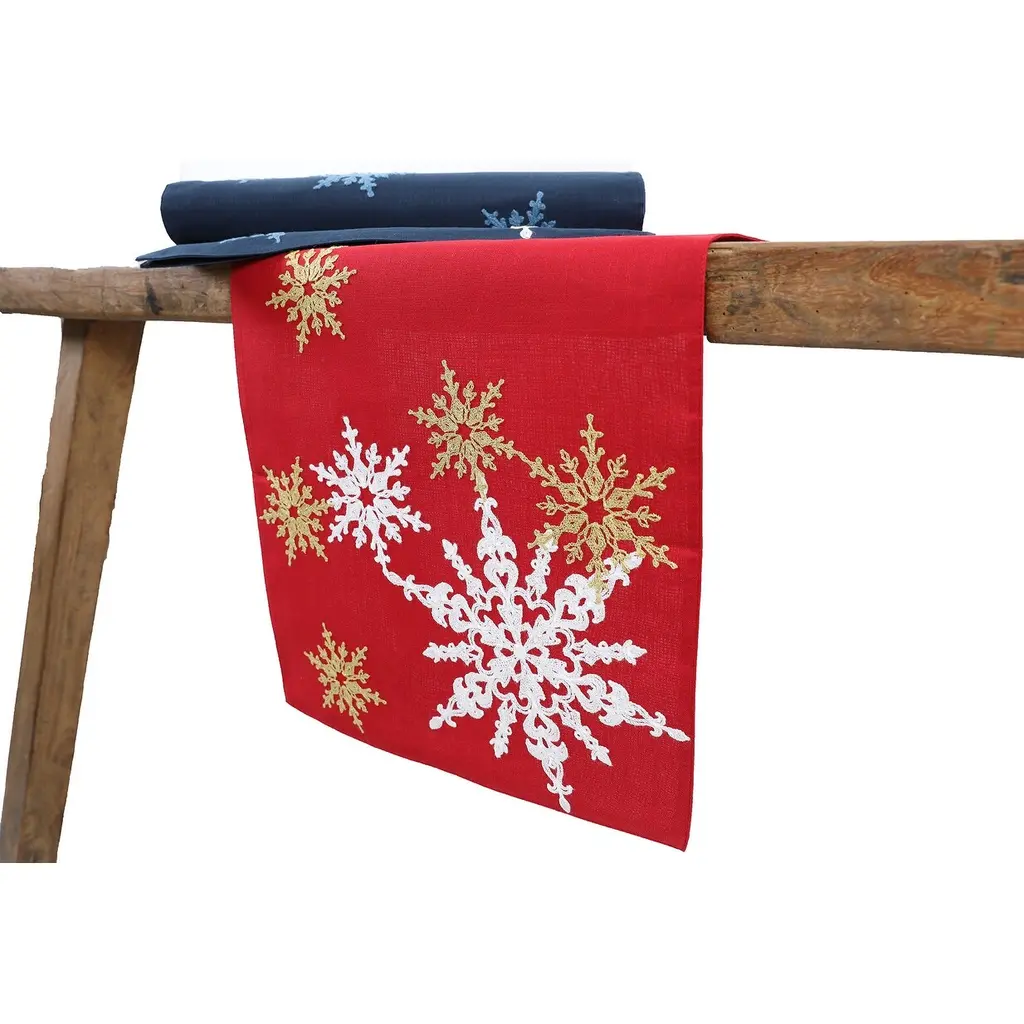 Various shapes and colors snowflakes crewel embroidered on holiday red or blue background. This table linens collection creates a warm and festive setting for your holiday meals and gatherings! Make this appealing for any Christmas holiday setting. Made from easy care polyviscose and machine washable. As your definitive home décor destination, we feels that every day should be lived fashionably! Our distinctive designs, rich details, and tempting accessories are sure to endlessly fulfill your home's finicky fashion sense. Whether you are keeping up with the ever changing colors of the holidays and seasons, looking for a stunning piece to tie your existing interior décor together while staying in tune with your individual style, or simply in need of an easy care focal point for an upcoming party or event, Xia Home Fashions and Manor Luxe has stylish creations that will complete your look and win complements at your next gathering!, White and Gold Crewel Embroidered Chirstmas Snowflakes, Double Layers. Reversible use, reverse side is solid color. , Different length available.36", 70" and 90", Made with easy care polyester. Machine Washable, Available in Red and Dark Blue, Matching Placemats, Table Runners available., Christmas dinner will be perfectly accented with these warm and inviting holiday linens! Perfect Christmas Gifts.
