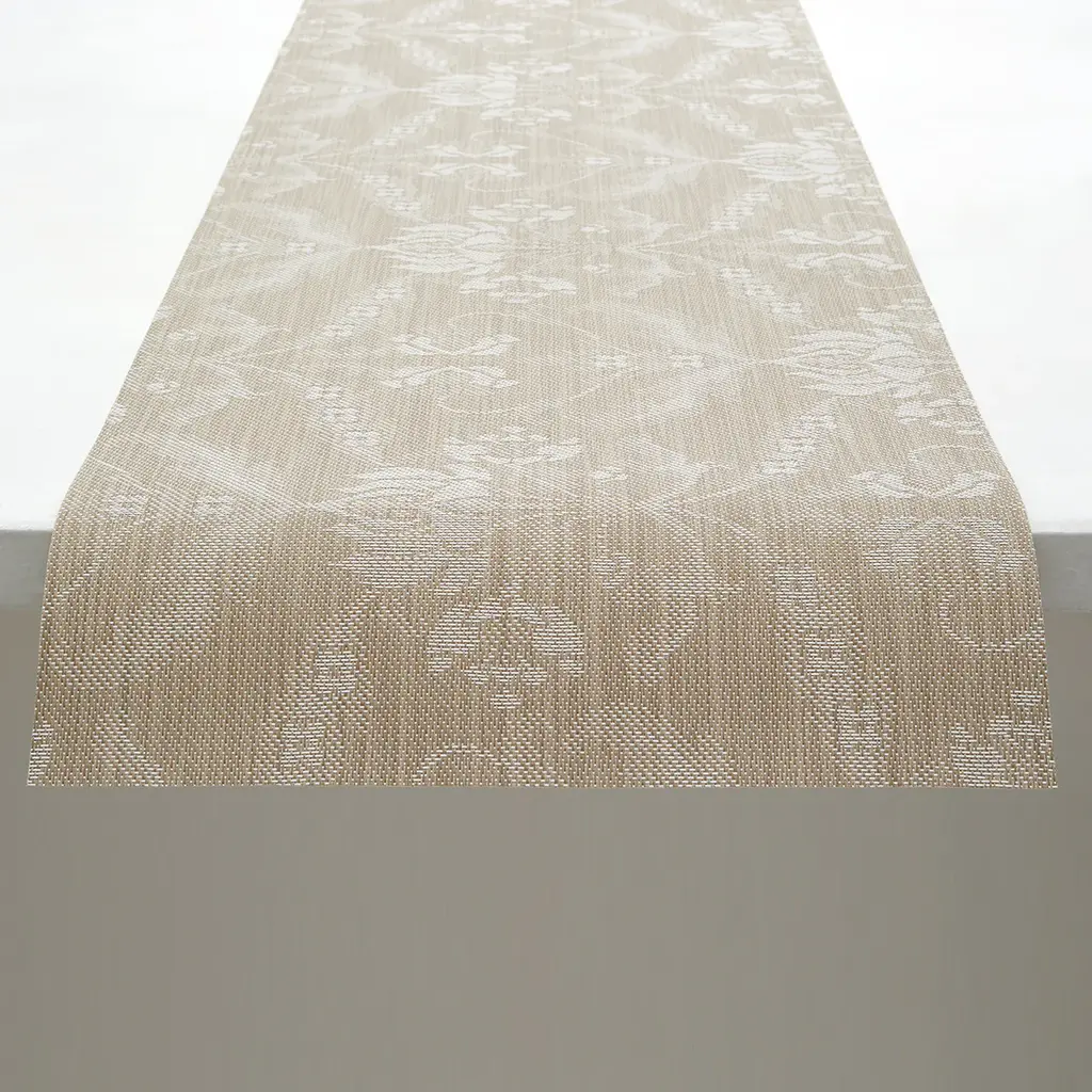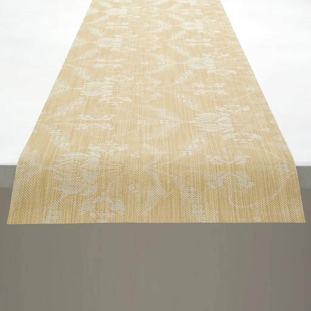 The Martha Stewart Damask Table Runner from Chilewich exemplifies refined textile artistry through its distinguished collaboration, drawing inspiration from the venerable tradition of tapestry craftsmanship. This exquisite jacquard weave reinterprets the classical symmetry and nuanced monochromatic elegance of traditional damask textiles, featuring intricately rendered botanical motifs—intertwining florals and acanthus leaf patterns—reimagined through a contemporary chromatic lens. With exceptional versatility, this sophisticated table accent offers dual aesthetic possibilities; when inverted, the color composition transforms completely, providing discerning hosts with two distinct expressions of elegance within a single, meticulously crafted piece. Highlights