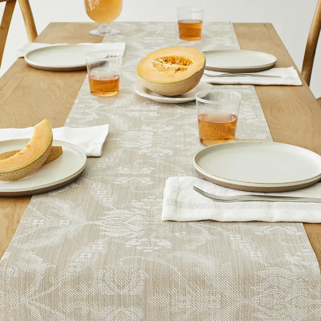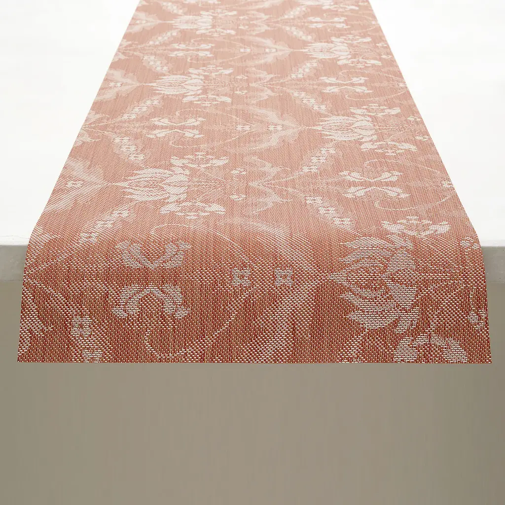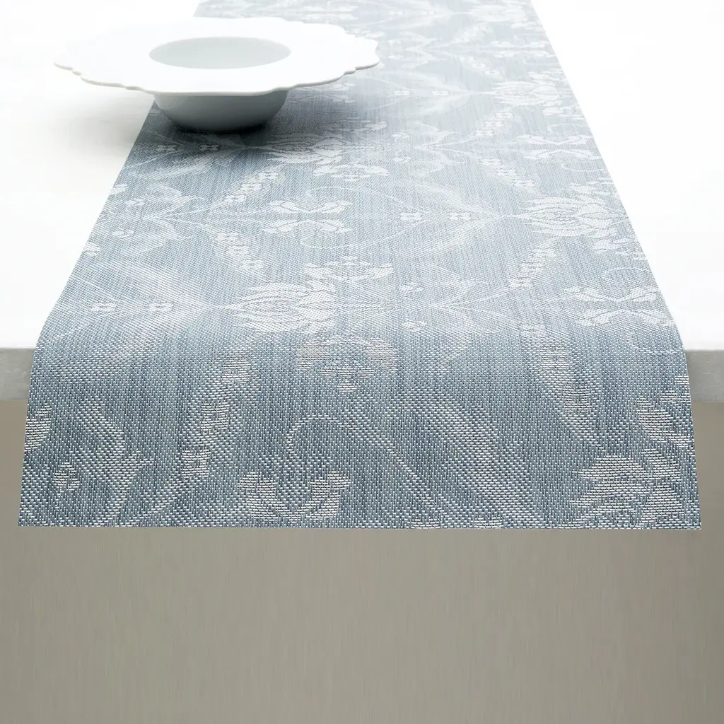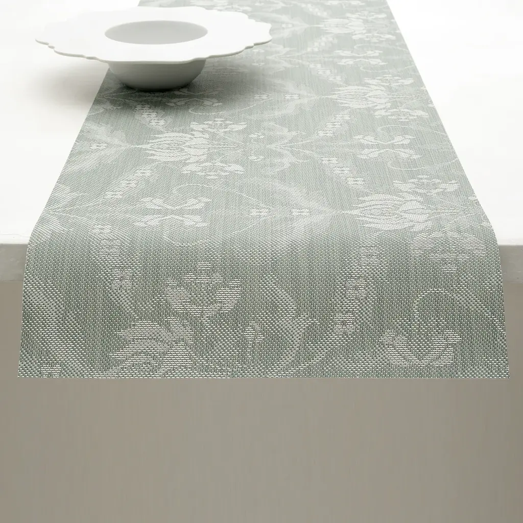 The Martha Stewart Damask Table Runner from Chilewich exemplifies refined textile artistry through its distinguished collaboration, drawing inspiration from the venerable tradition of tapestry craftsmanship. This exquisite jacquard weave reinterprets the classical symmetry and nuanced monochromatic elegance of traditional damask textiles, featuring intricately rendered botanical motifs—intertwining florals and acanthus leaf patterns—reimagined through a contemporary chromatic lens. With exceptional versatility, this sophisticated table accent offers dual aesthetic possibilities; when inverted, the color composition transforms completely, providing discerning hosts with two distinct expressions of elegance within a single, meticulously crafted piece. Highlights
