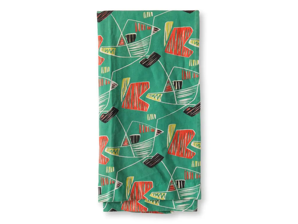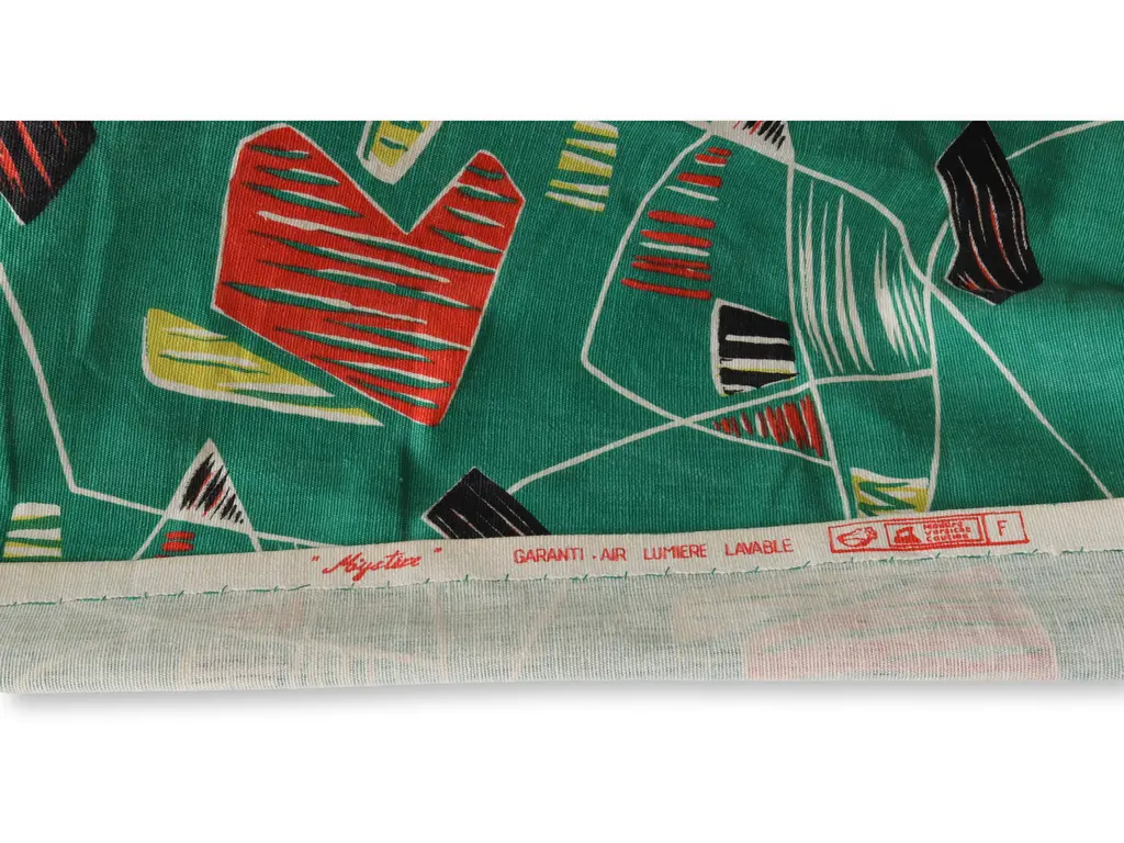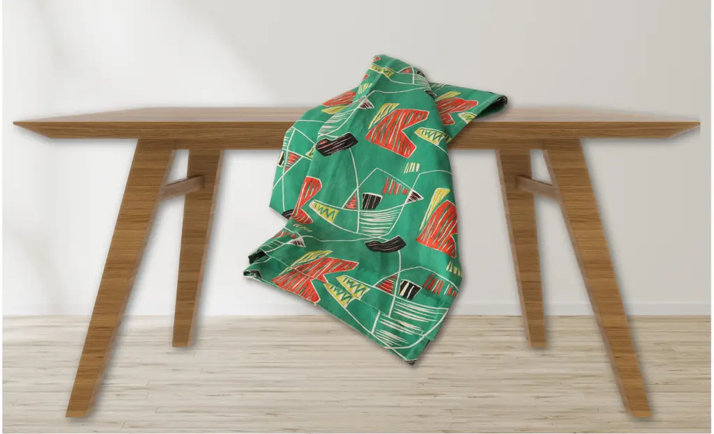 Vintage French Table Runner, a cherished find from Paris. Featuring a classic mid-20th century abstract design on a vibrant green backdrop, this hand-hemmed piece exudes timeless elegance. Imprinted with manufacturer's marks on the selvages, it's a unique and historical addition to your table decor, blending artistry and heritage in one exquisite piece.