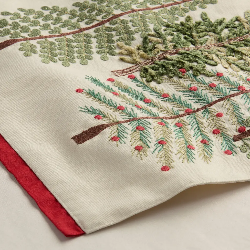 Bring wintry elegance to your holiday table with our exclusive table runner, embroidered with festive evergreen trees on a natural cotton ground. Handmade in India, this runner is a masterpiece on its own or layered with other table linens and themed decor. Trimmed in red, it adds a touch of woodland-inspired joy to your gathering space and is available in two sizes.